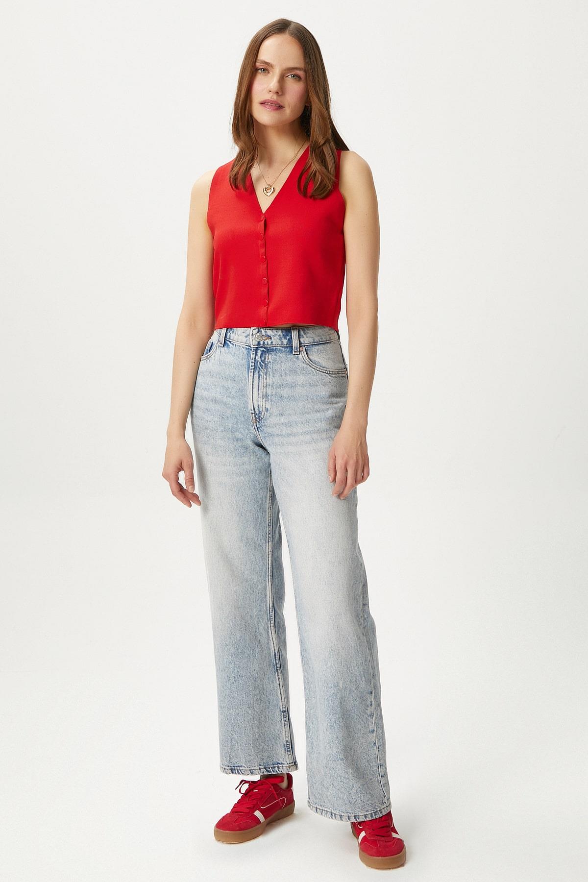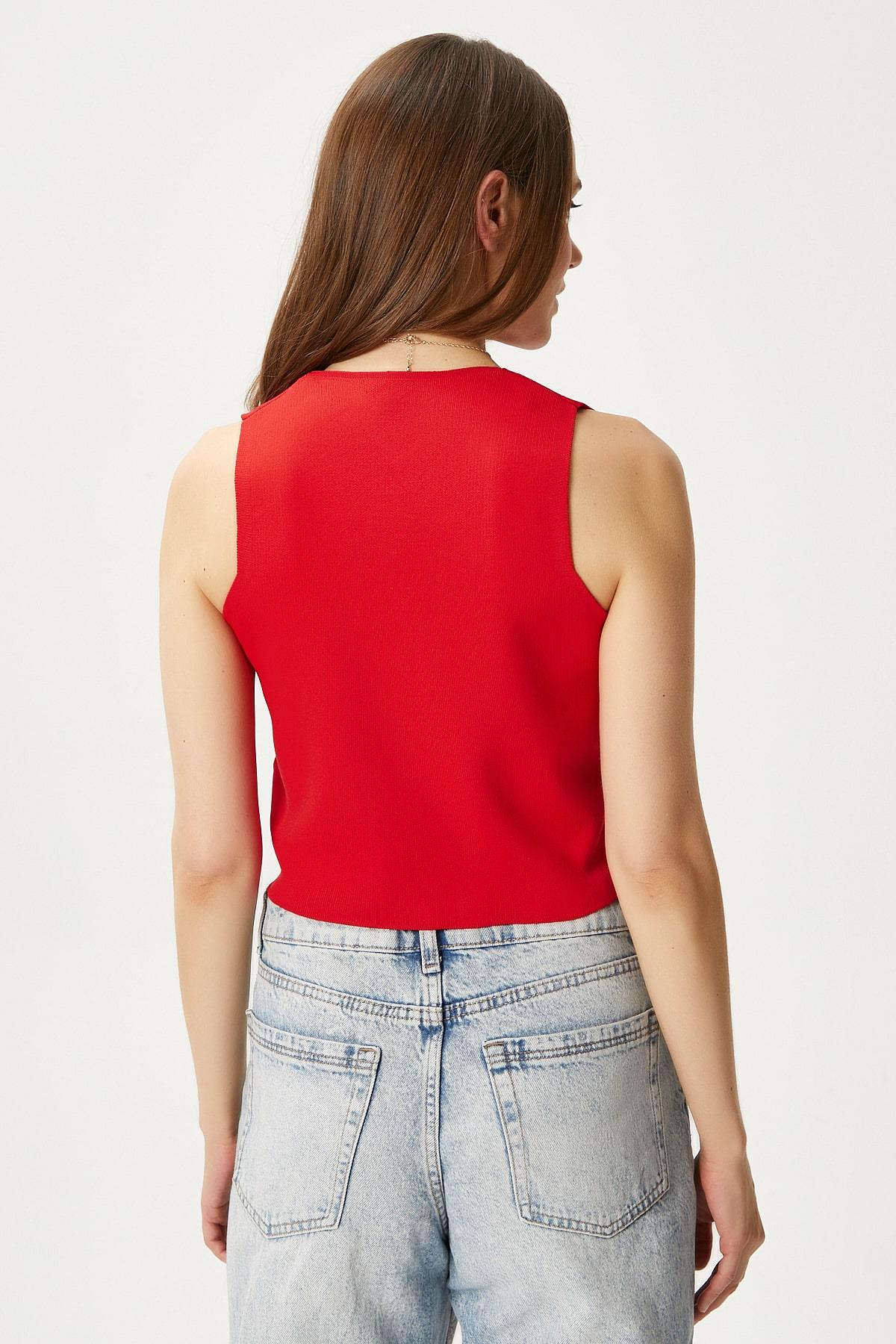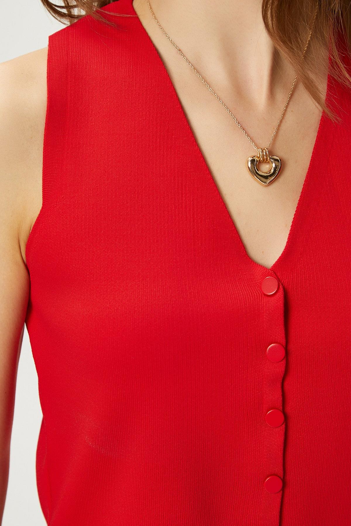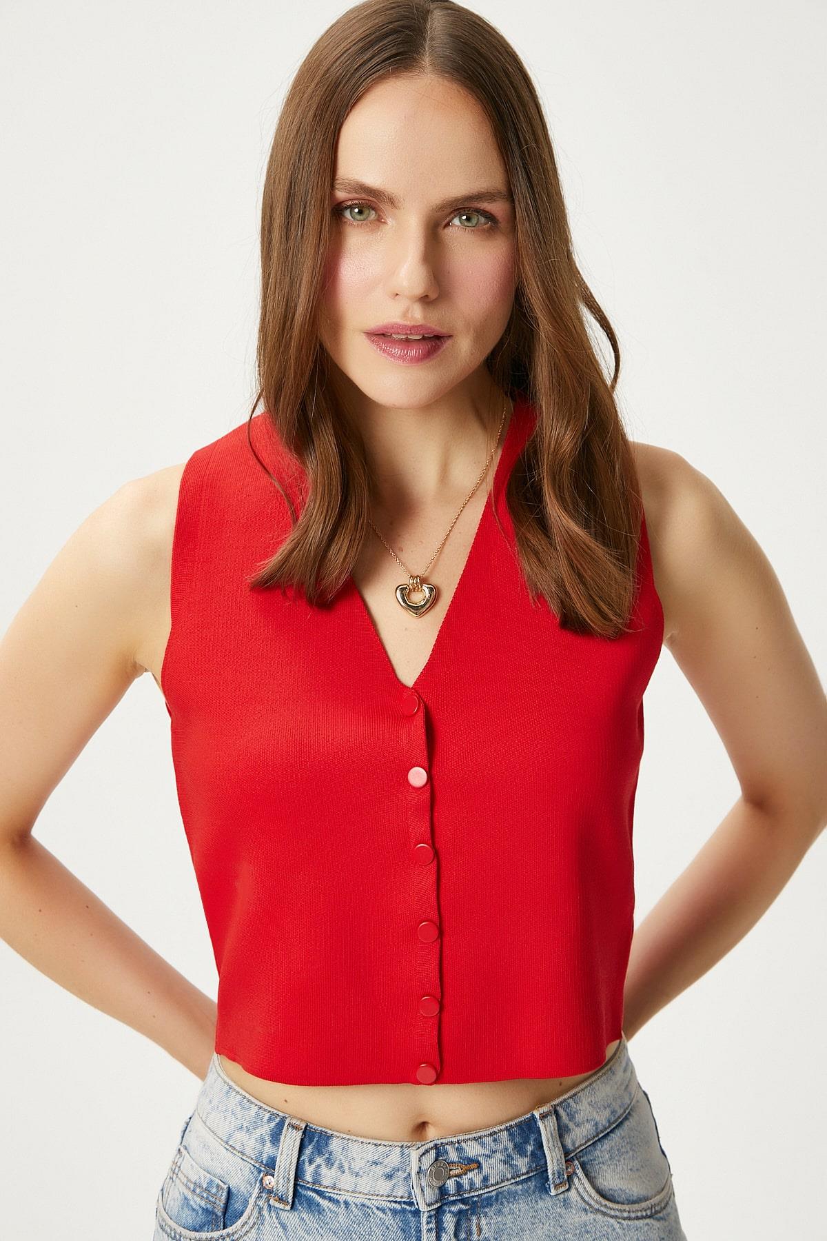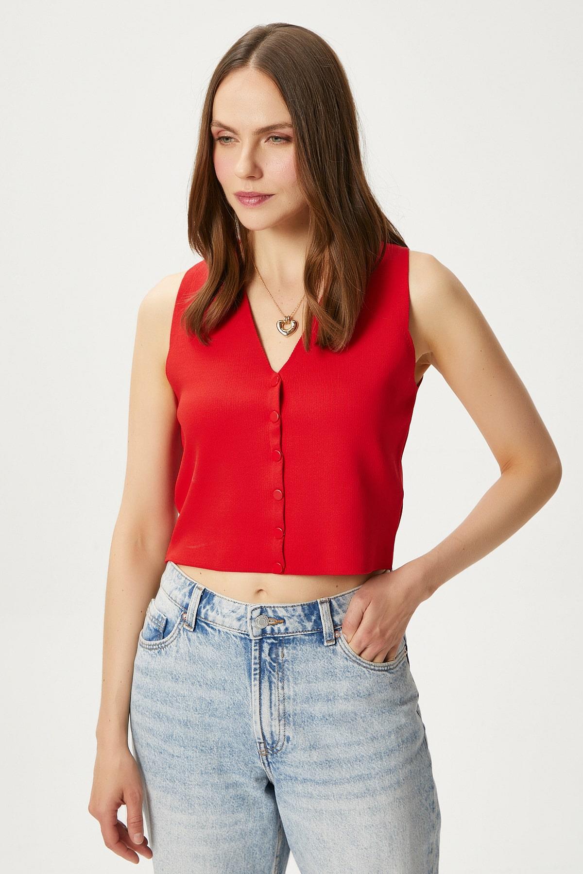 Kadın Petite Çıtçıtlı Crop Kırmızı Triko Yelek