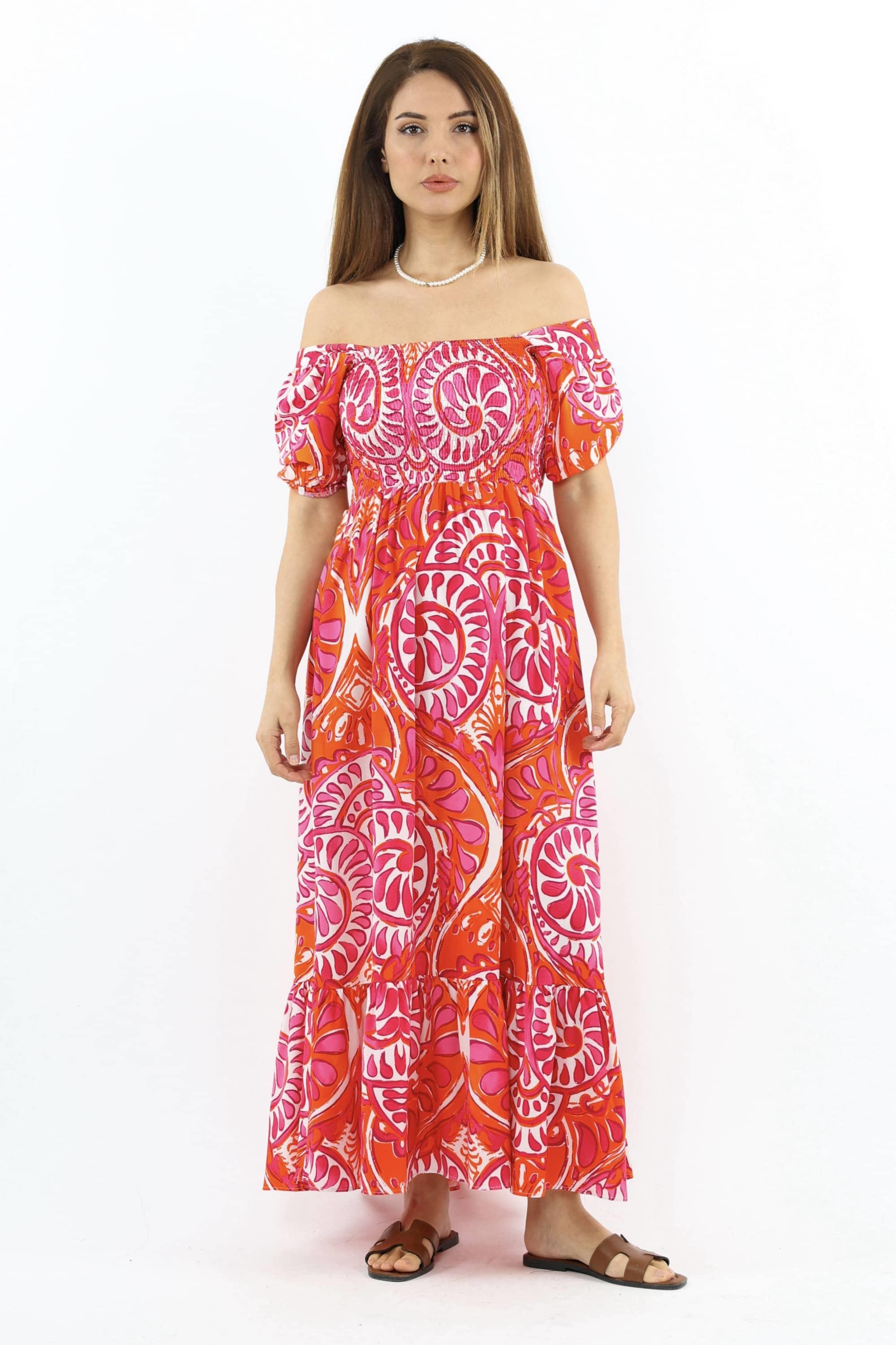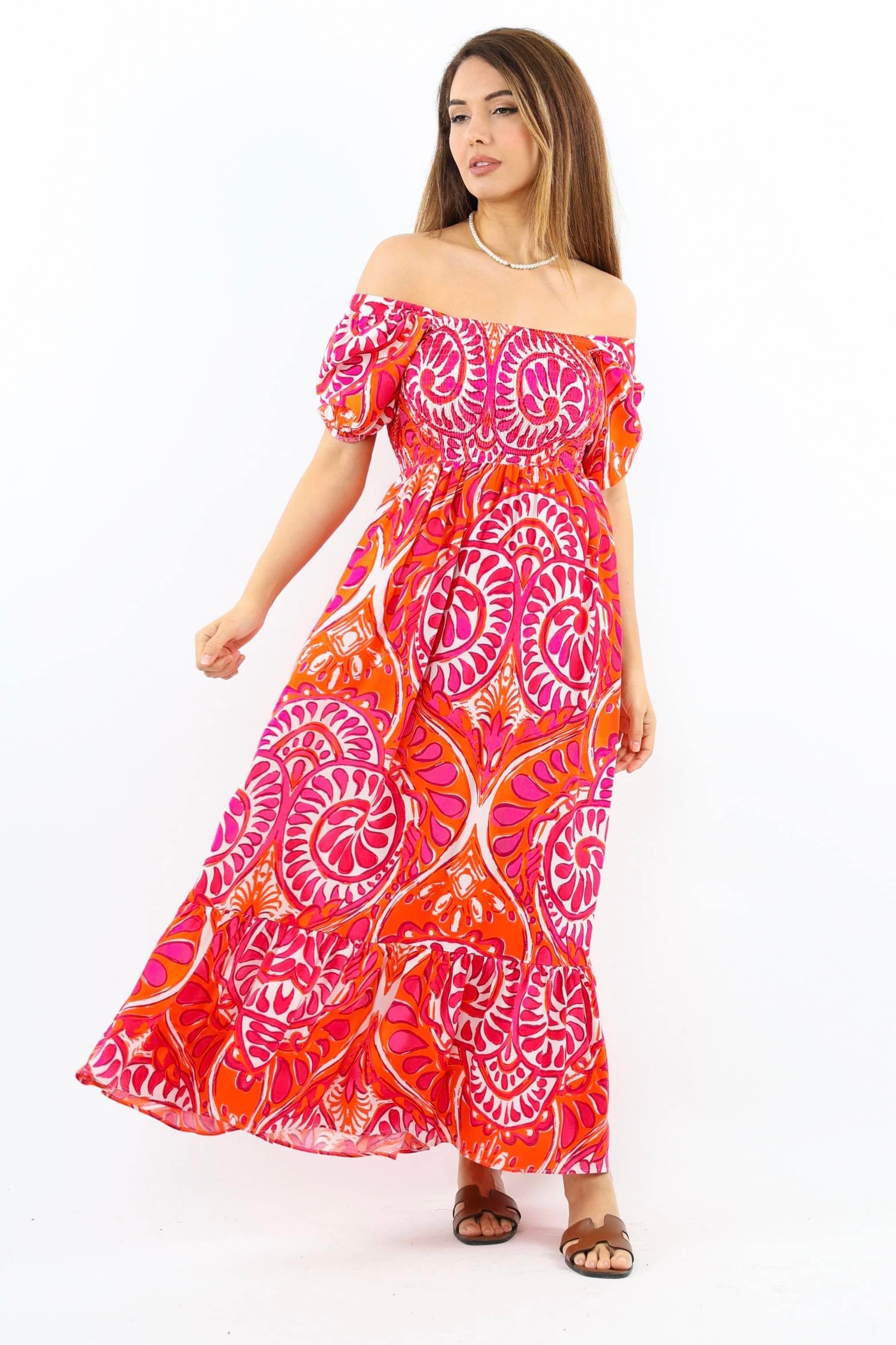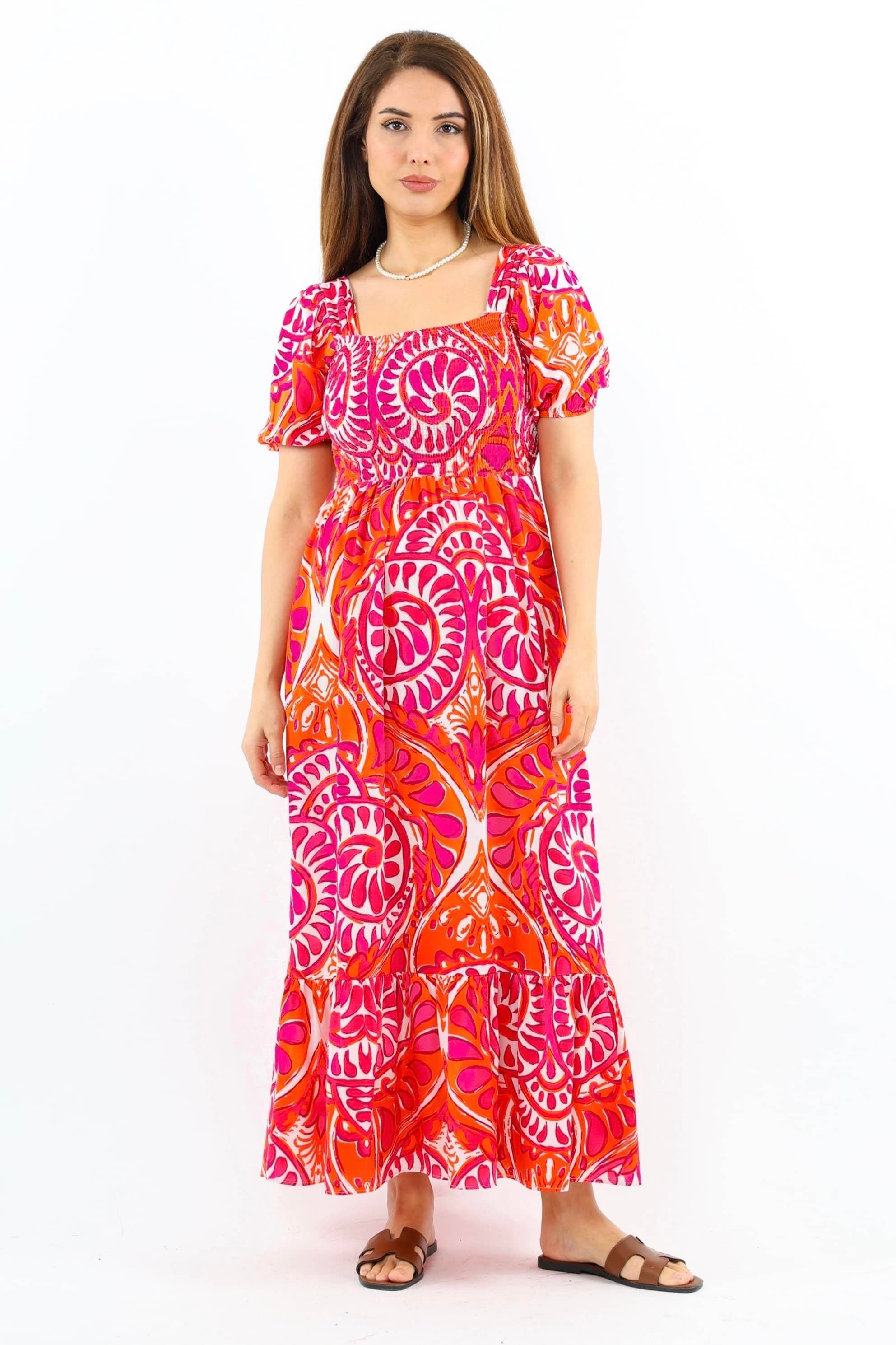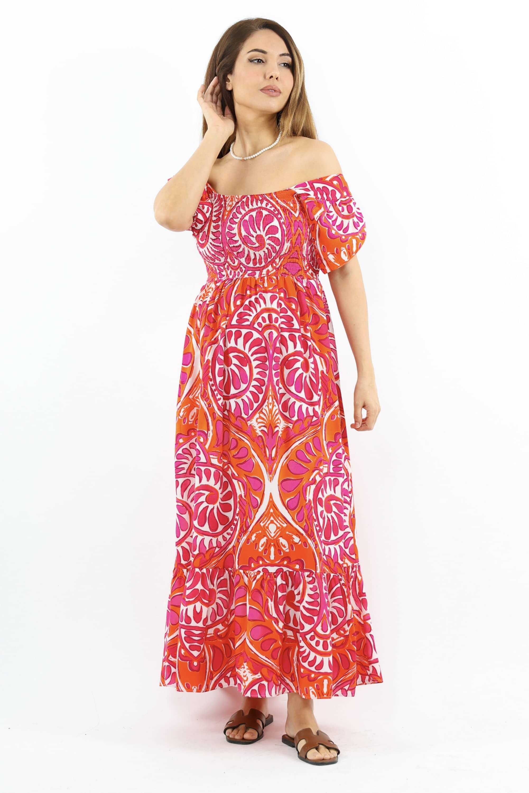 Kadın Positano Turuncu Pembe Gipeli %100 Viskon Uzun Elbise