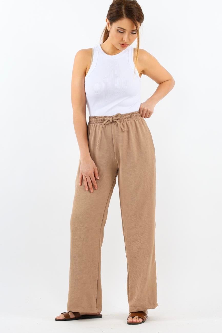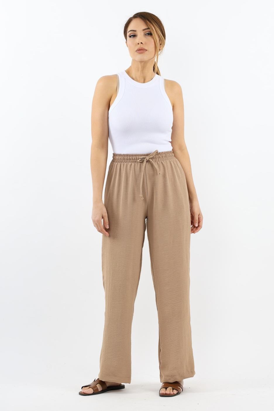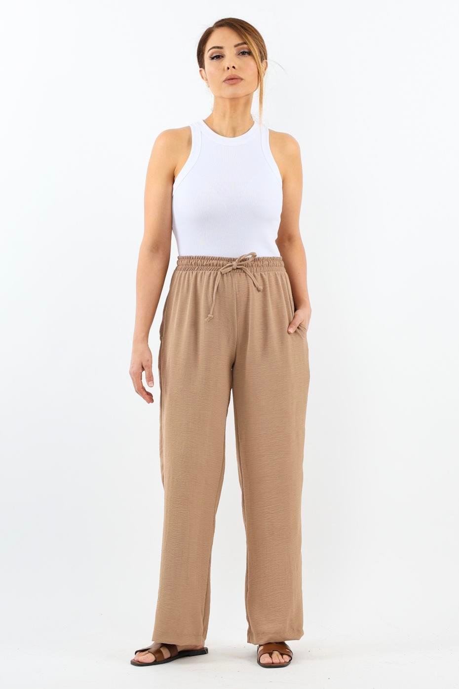Kadın Relaxed Bej Bel Lastikli Düz Kesim Cepli Ayrobin Pantolon