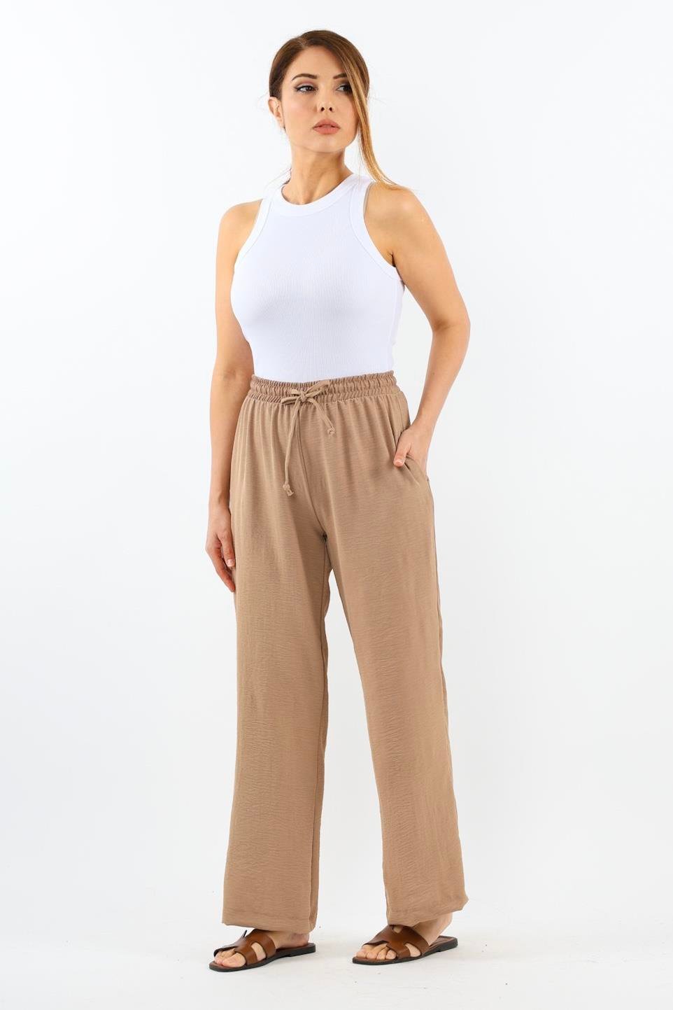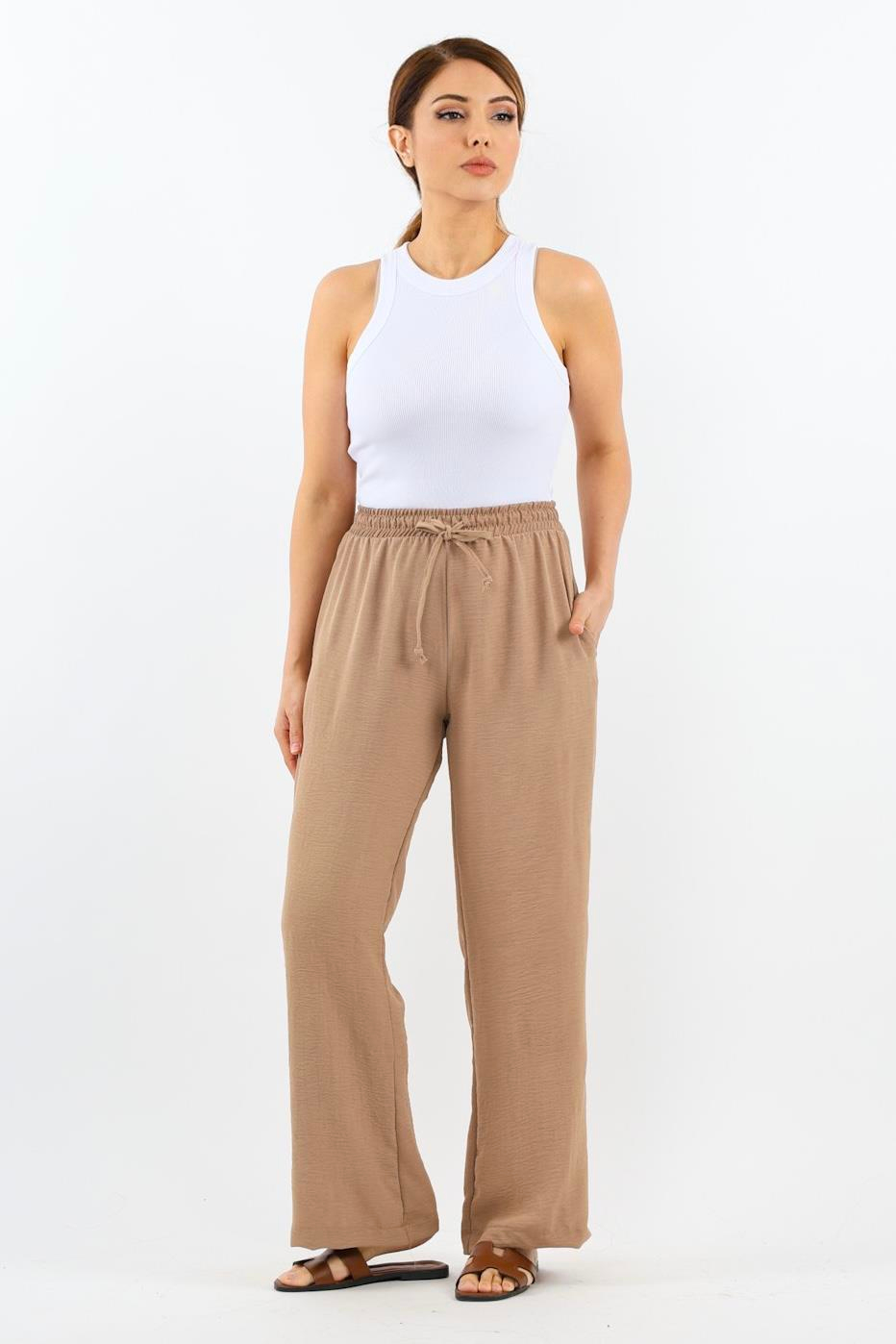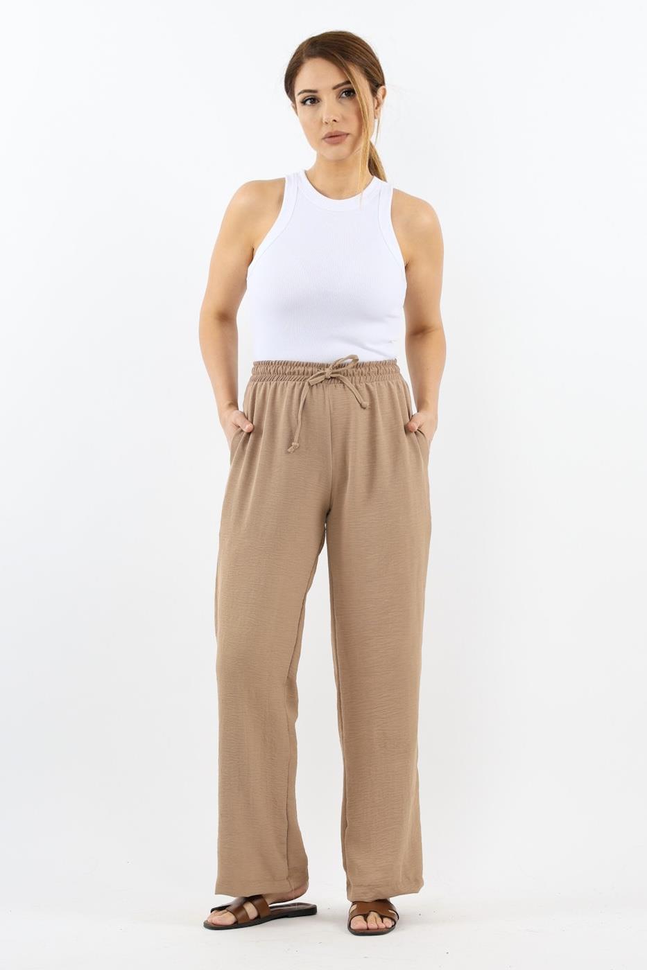Kadın Relaxed Bej Bel Lastikli Düz Kesim Cepli Ayrobin Pantolon