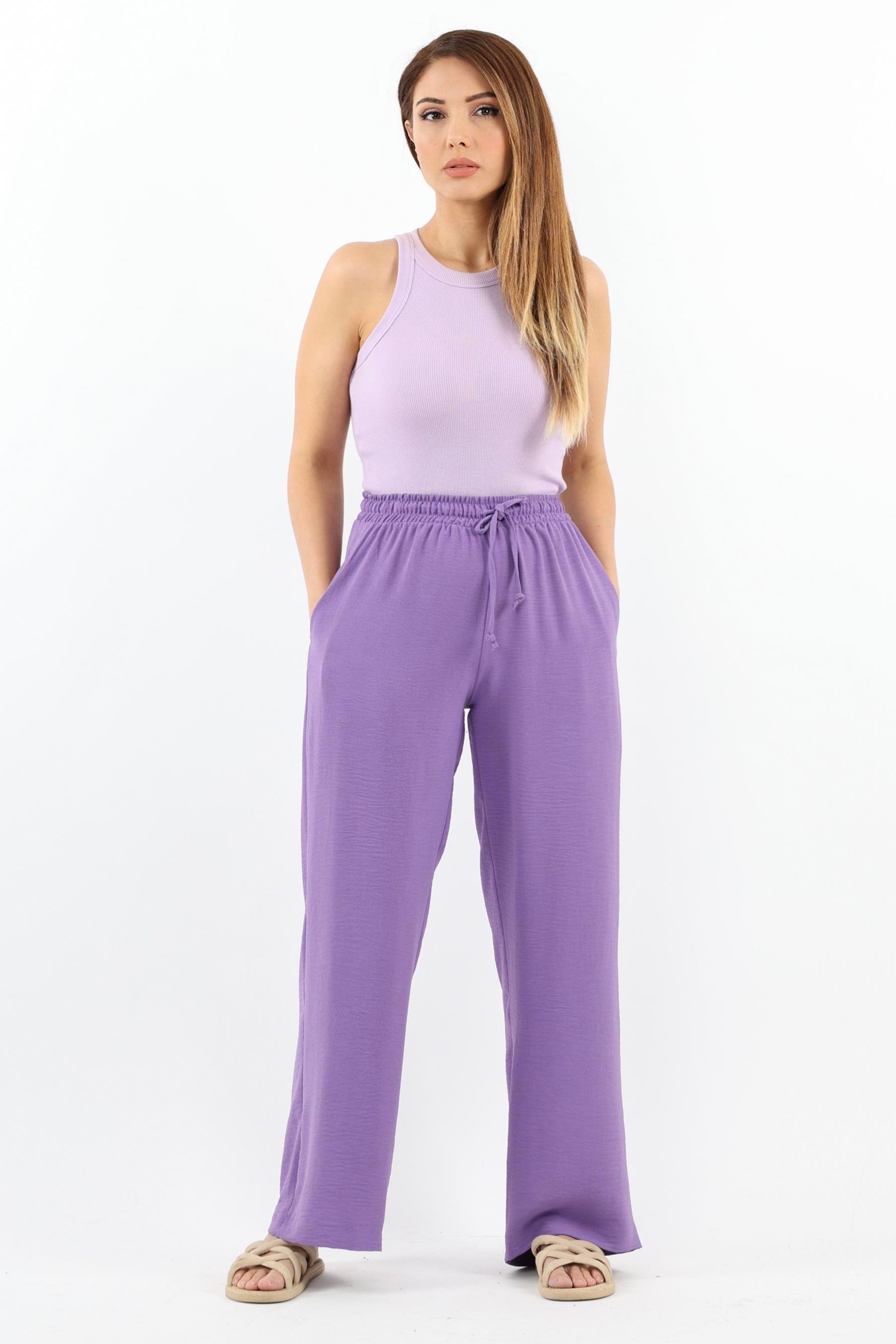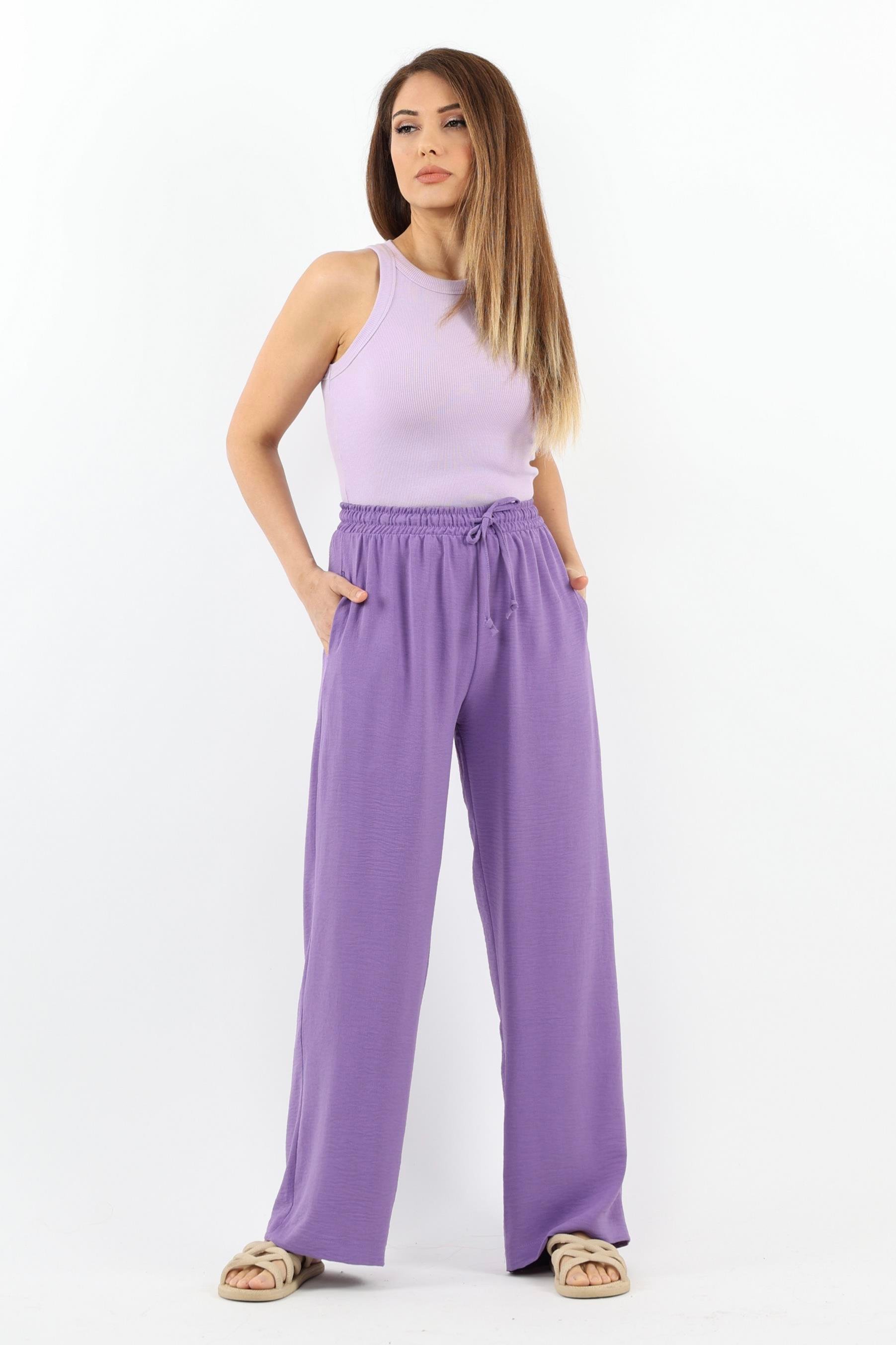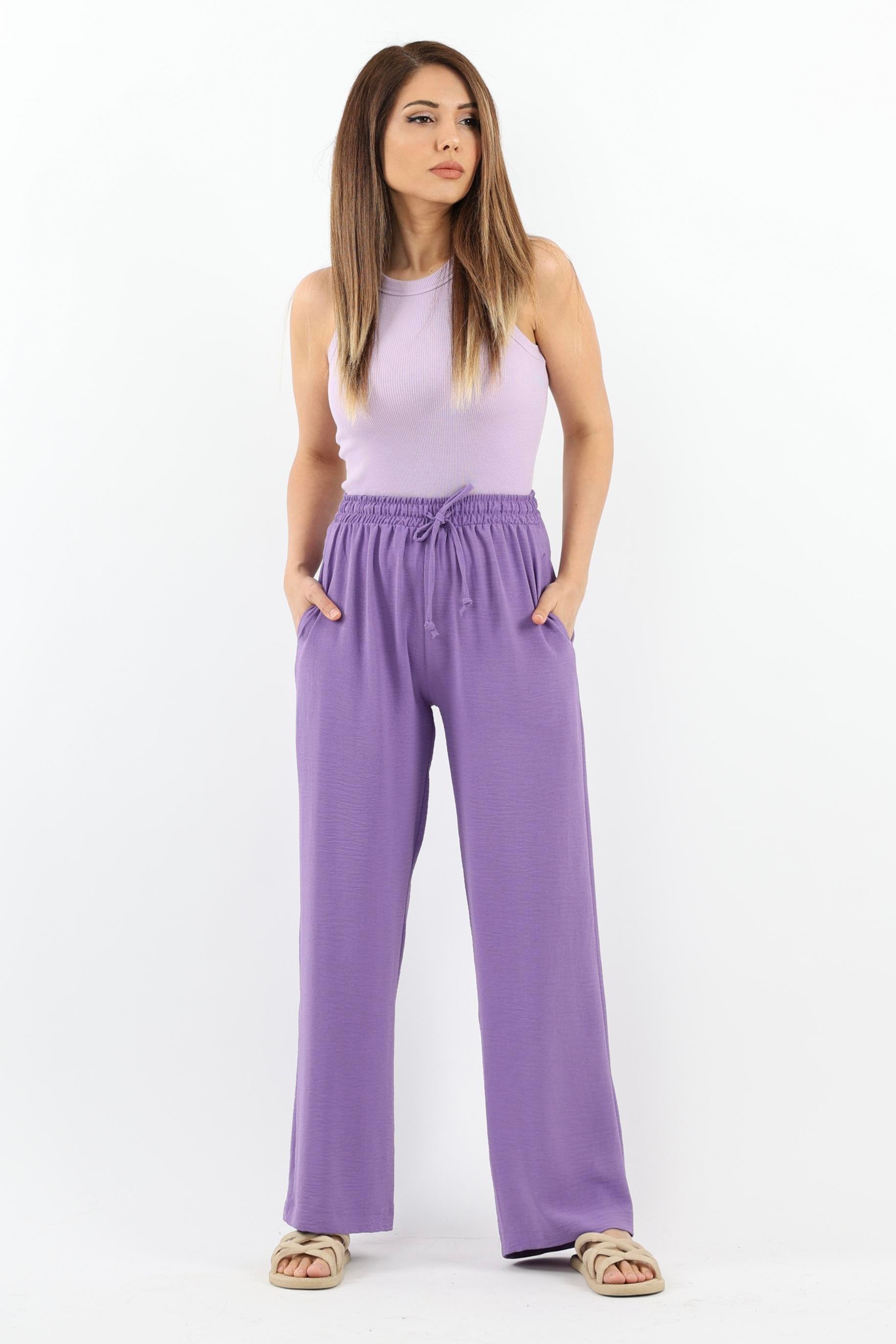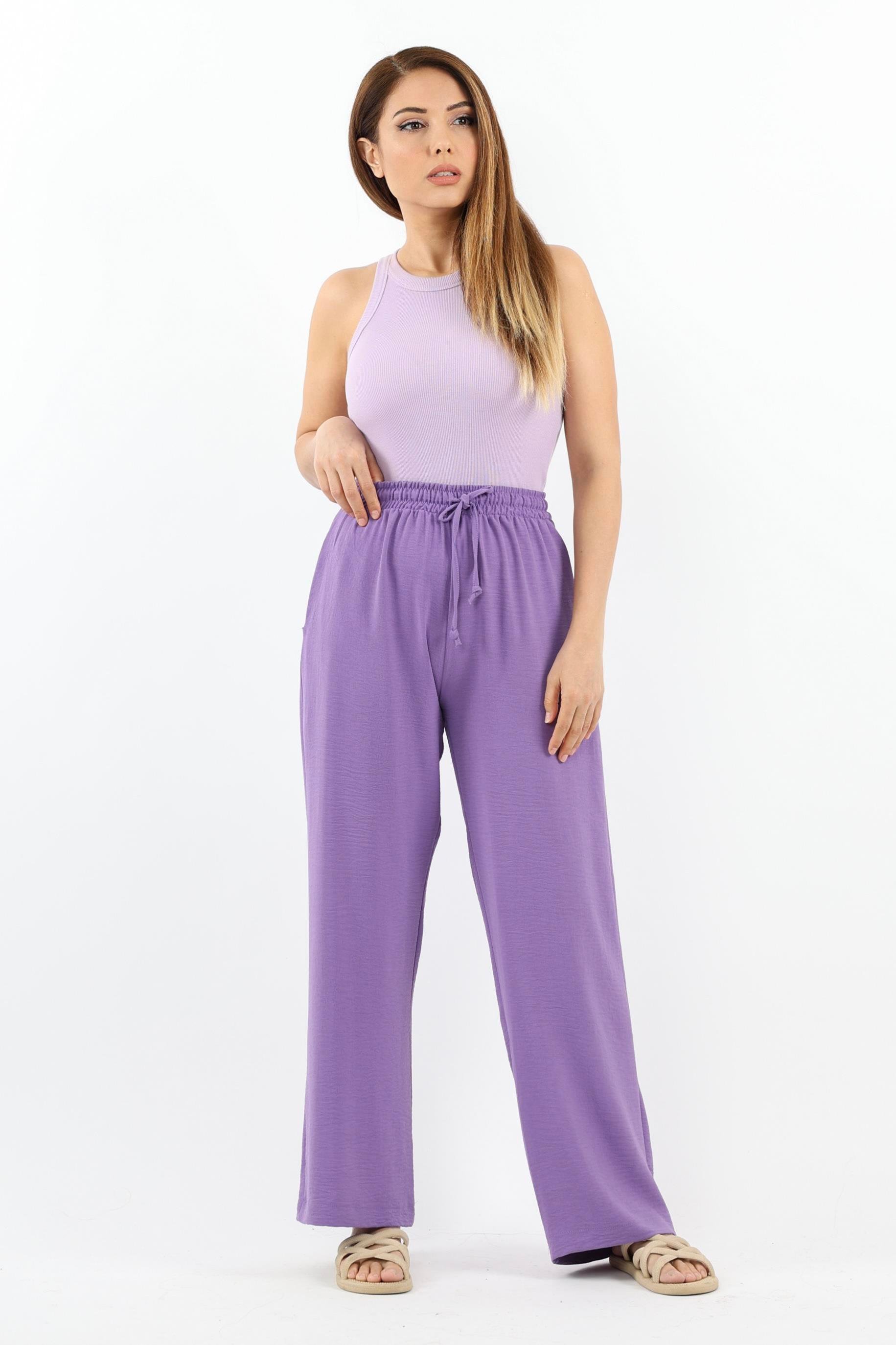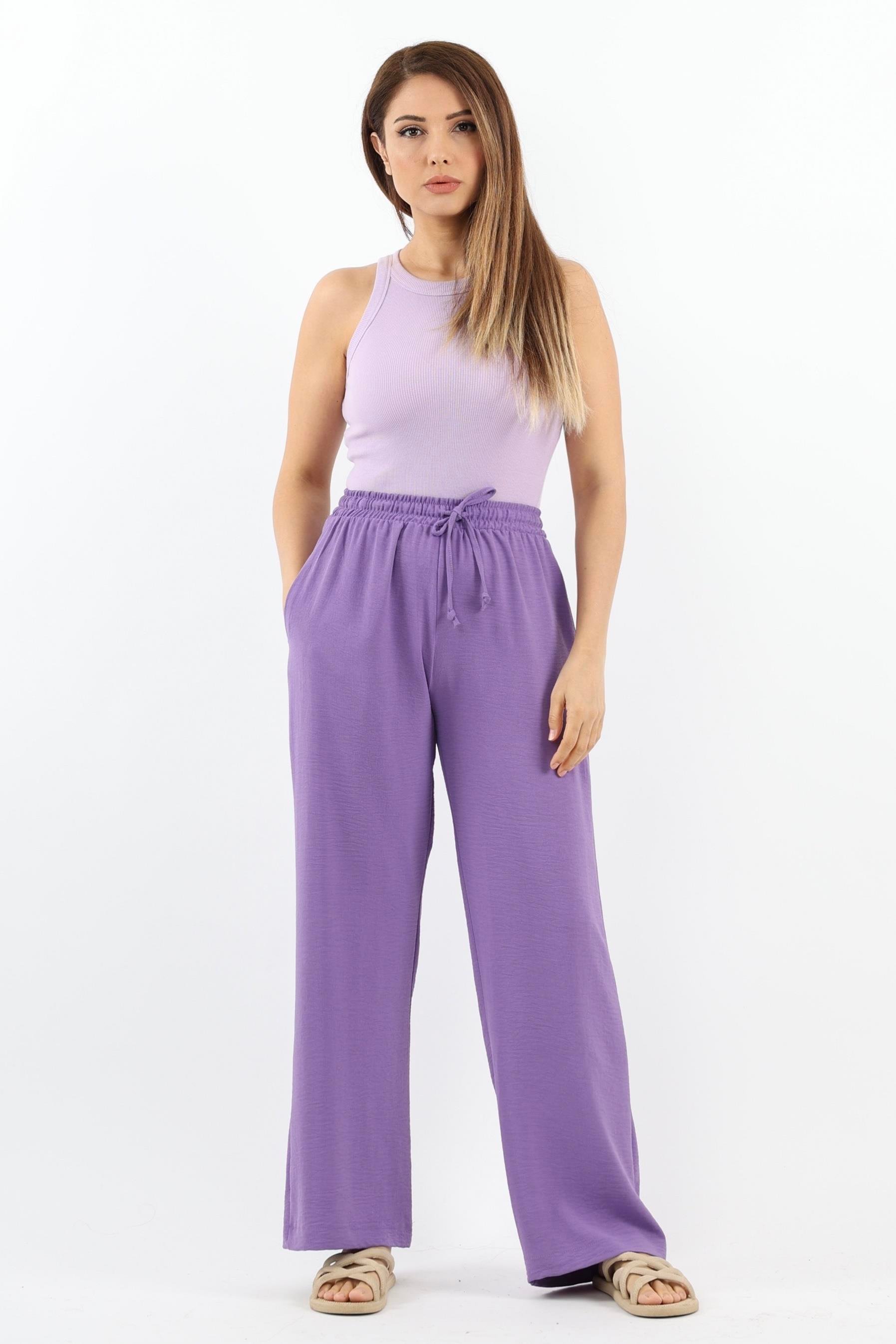 Kadın Relaxed Mor Bel Lastikli Düz Kesim Cepli Ayrobin Pantolon