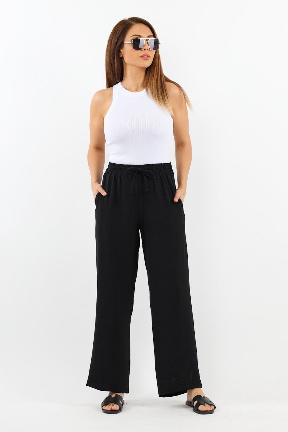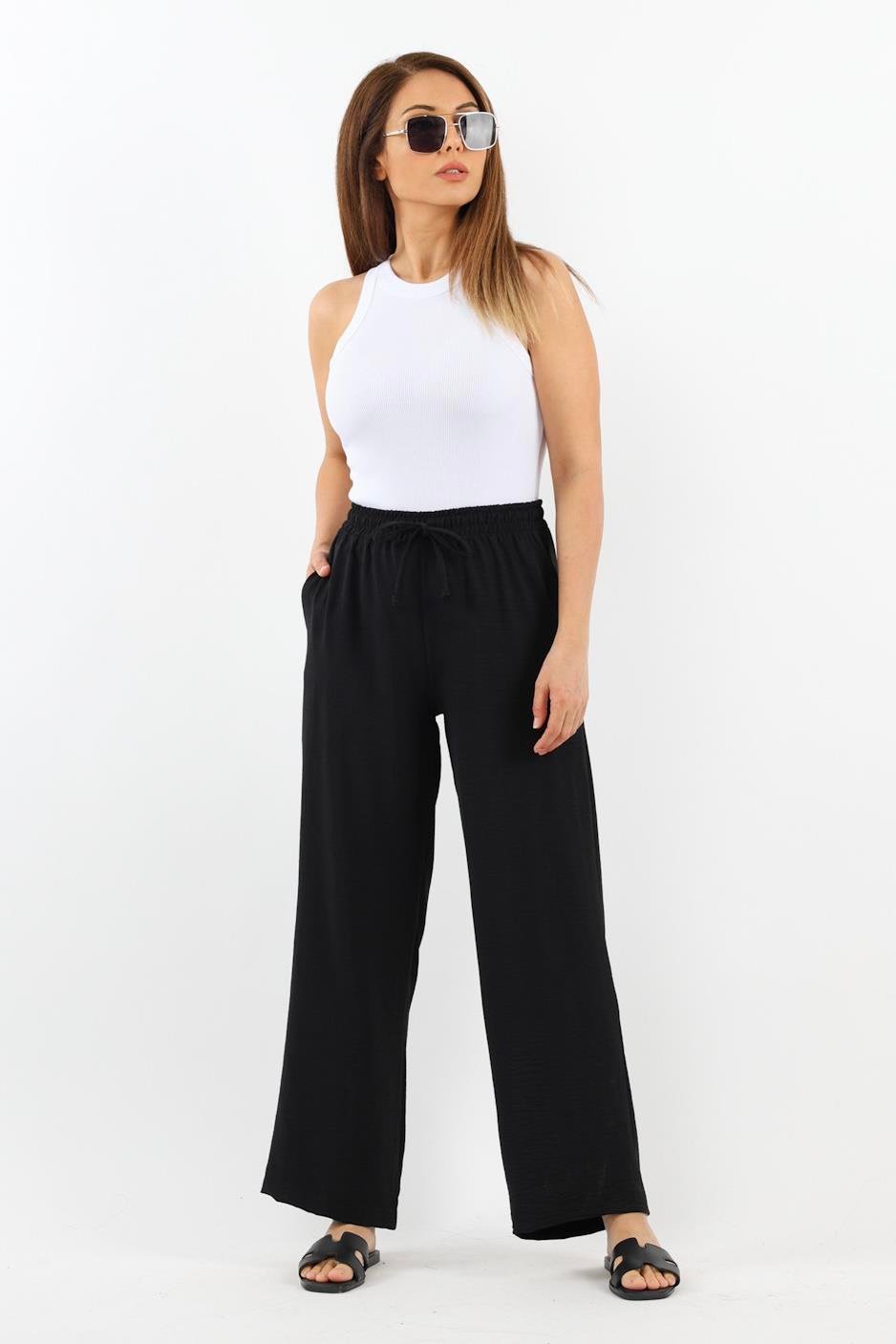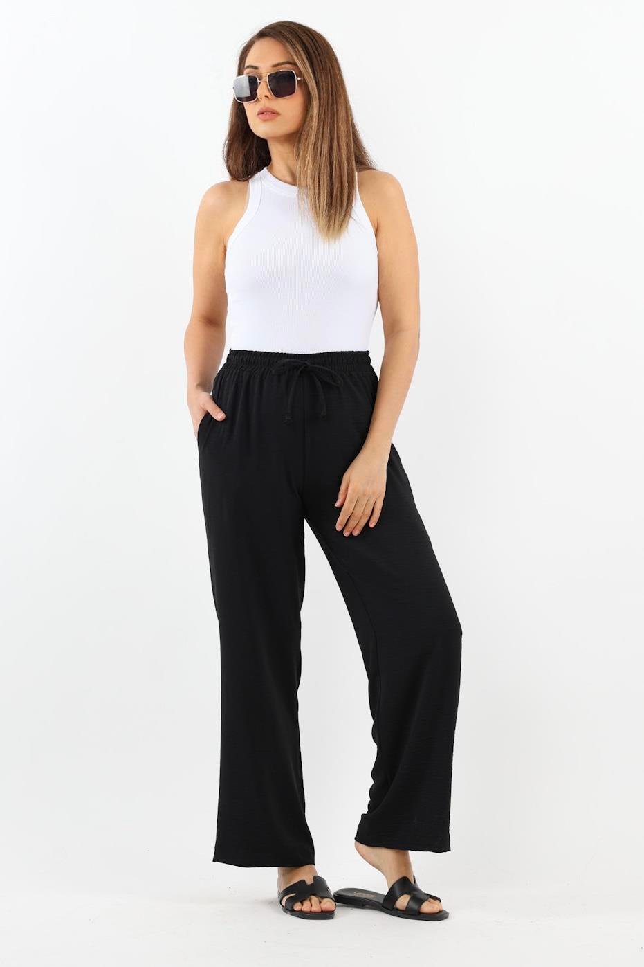 Kadın Relaxed Siyah Bel Lastikli Düz Kesim Cepli Ayrobin Pantolon