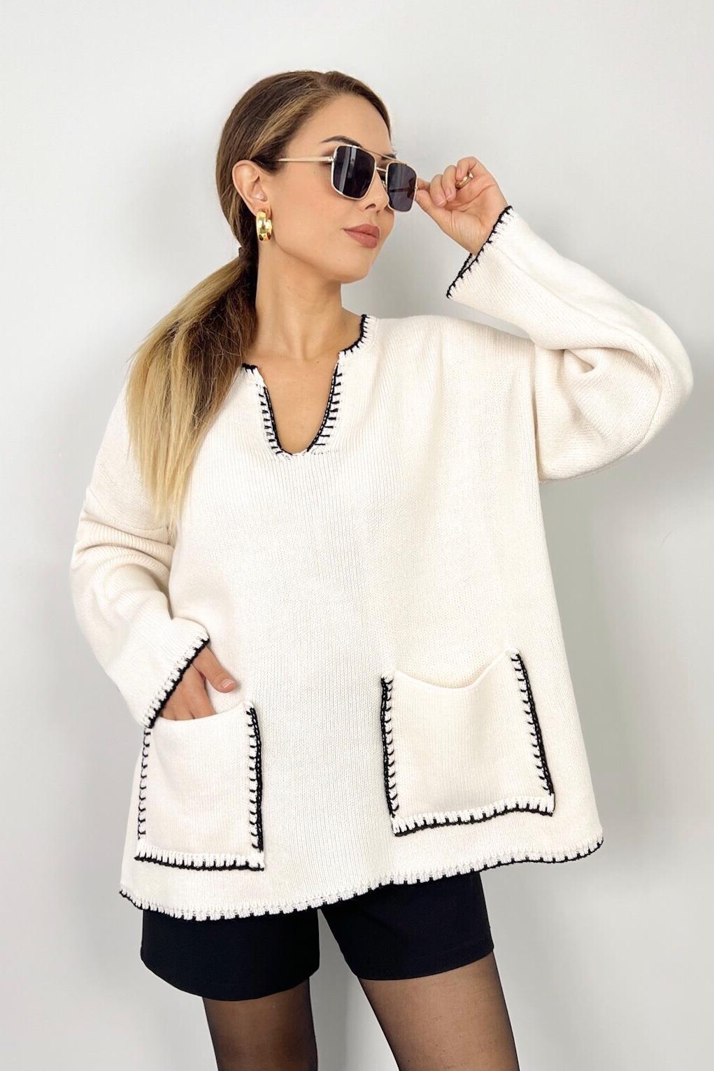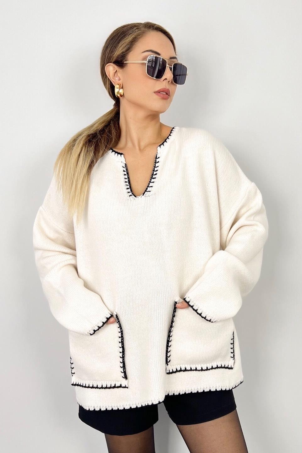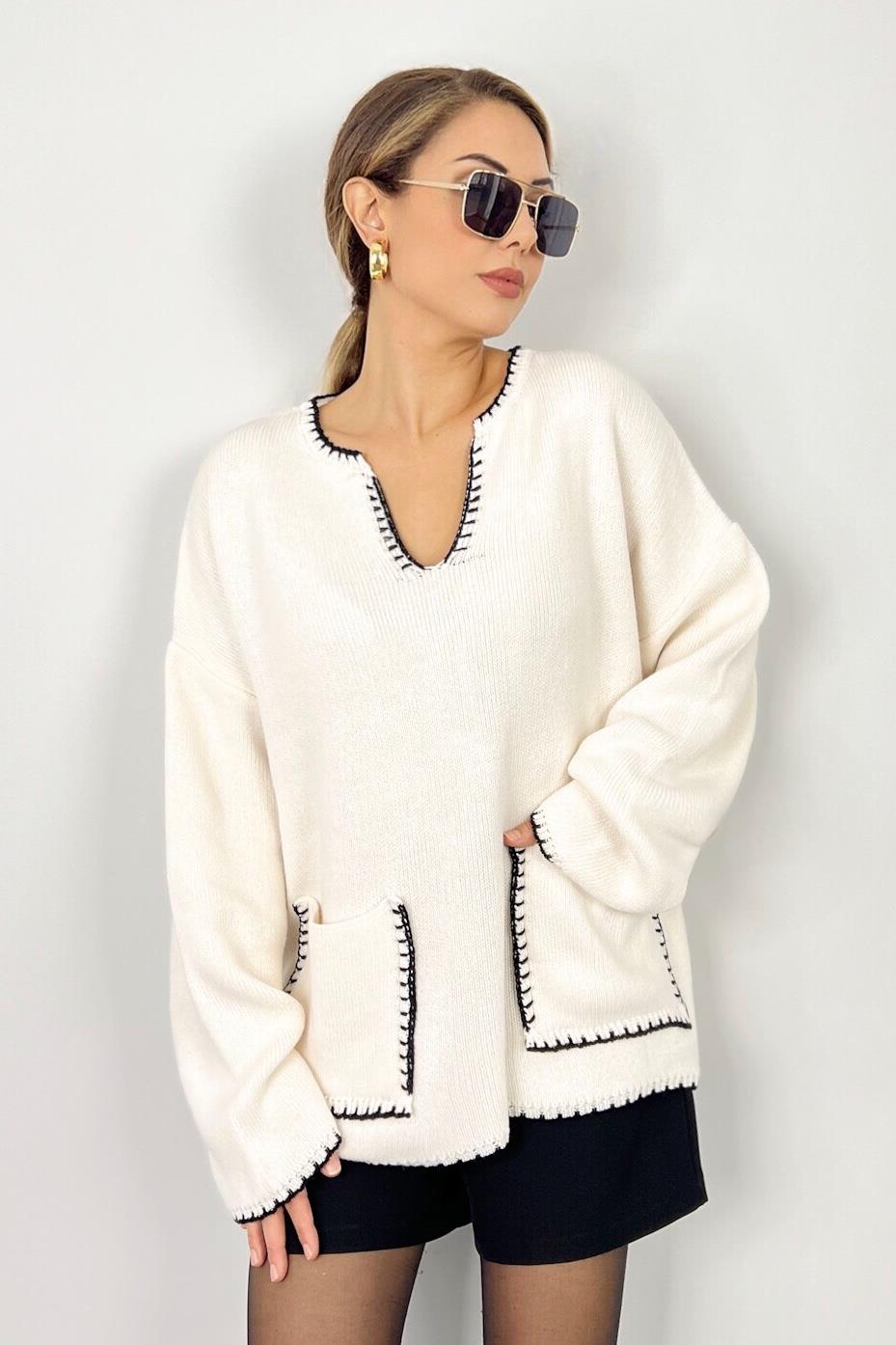 Geniş Kesim Ekru Kenarları İşlemeli V Yaka Triko Kazak