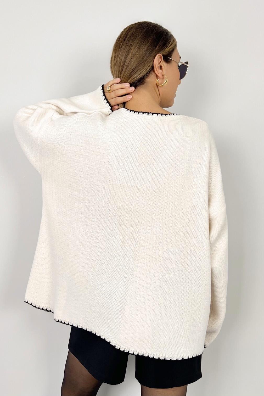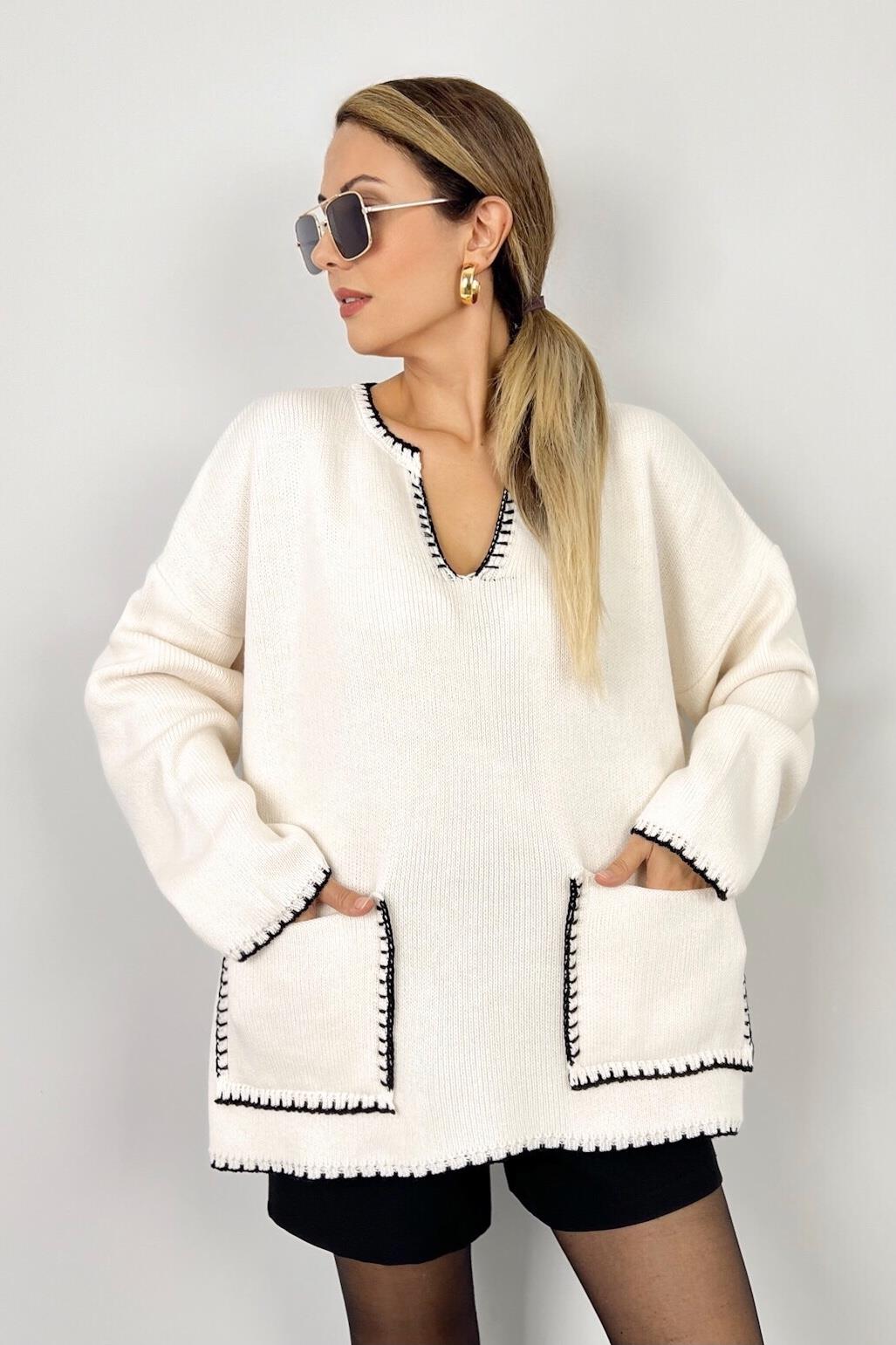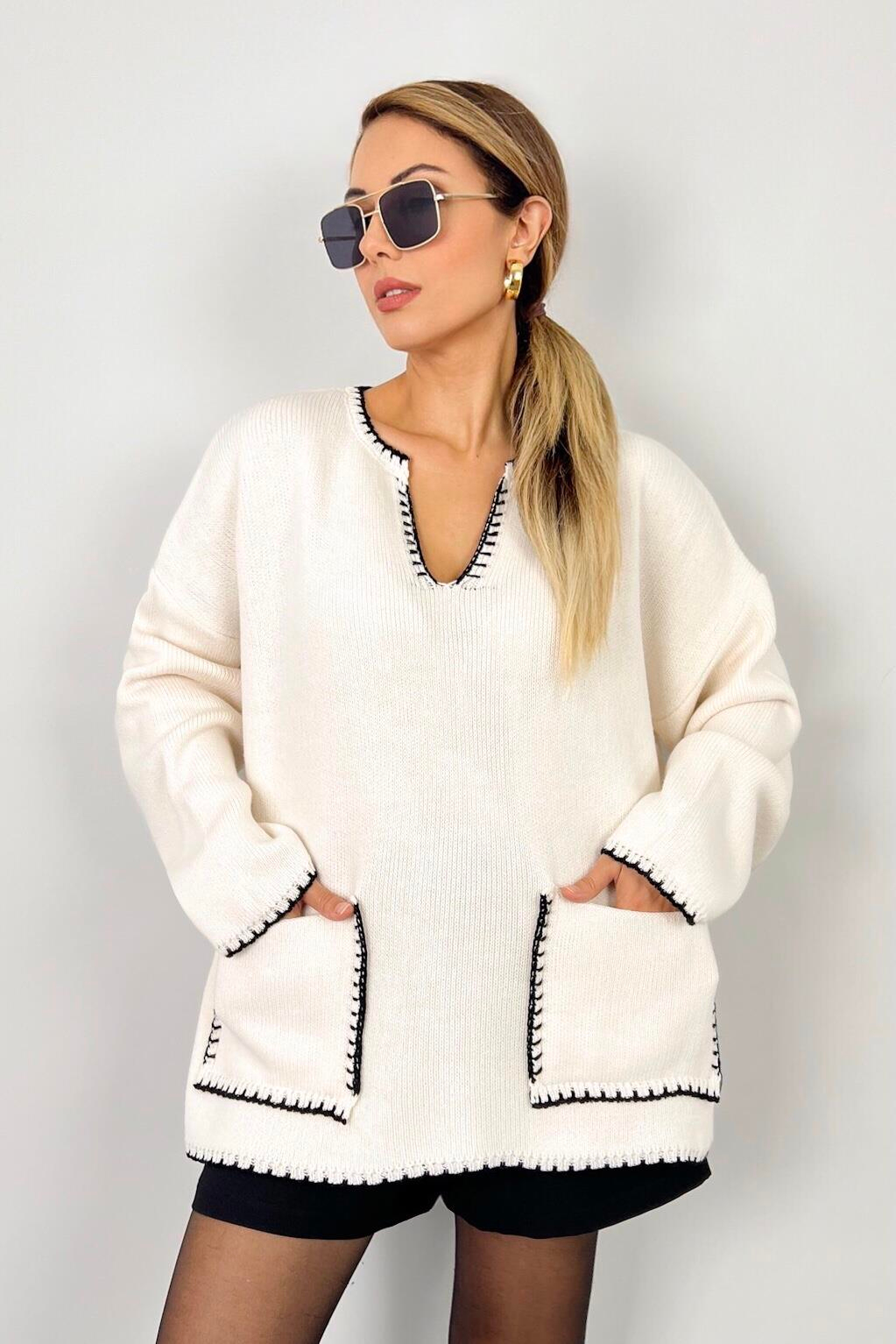 Geniş Kesim Ekru Kenarları İşlemeli V Yaka Triko Kazak