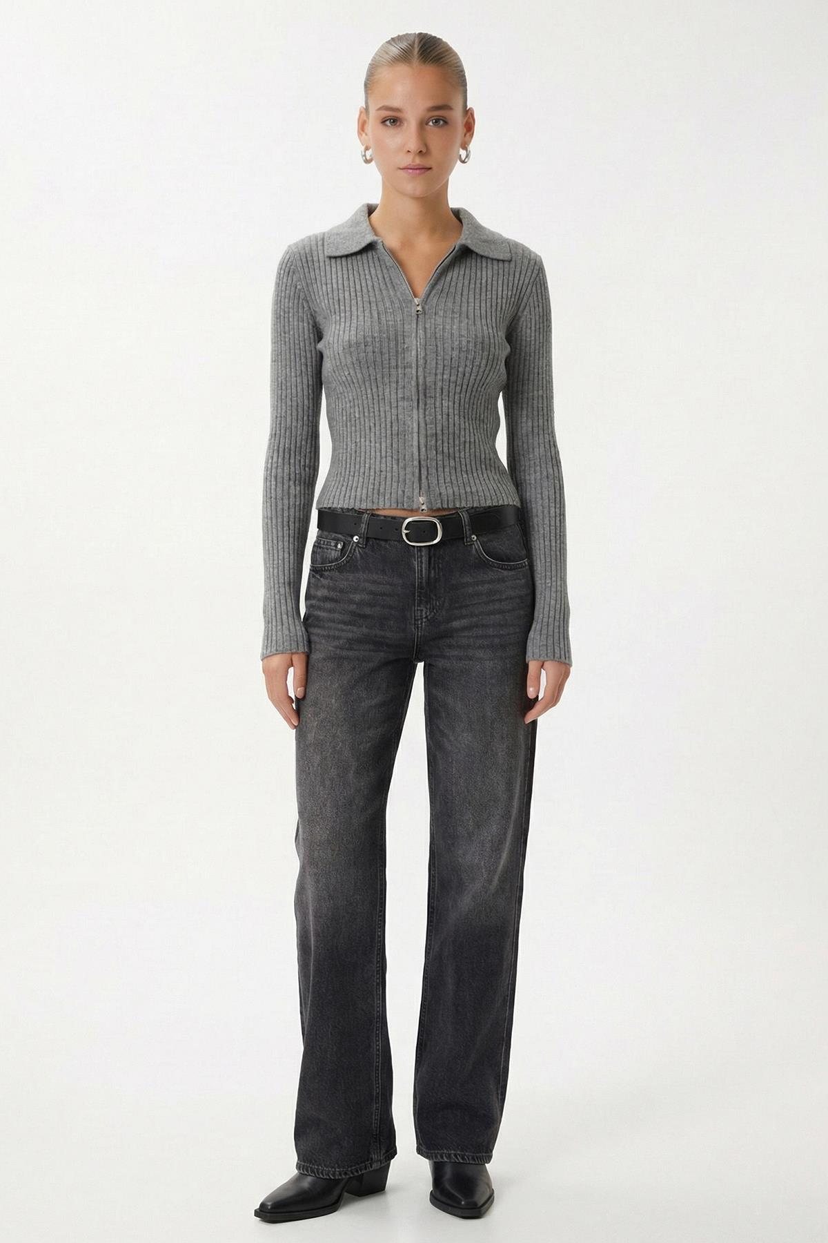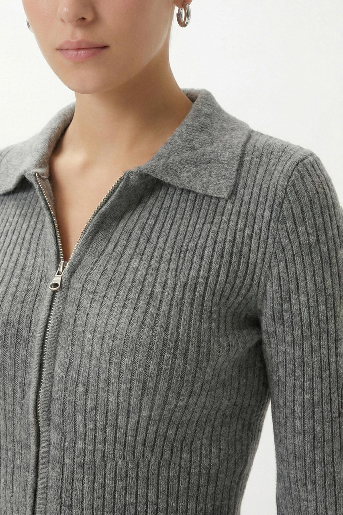 Kadın Sara Basic Yumuşak Dokulu Çift Taraf Fermuarlı Gri Triko Hırka,