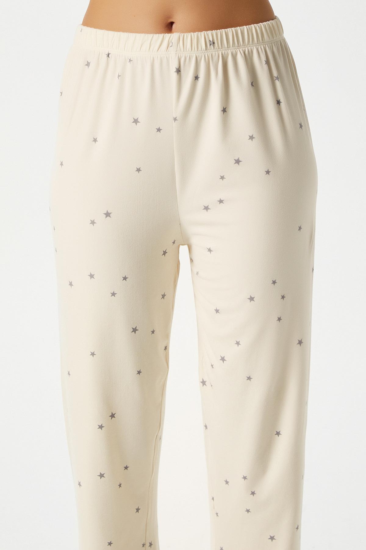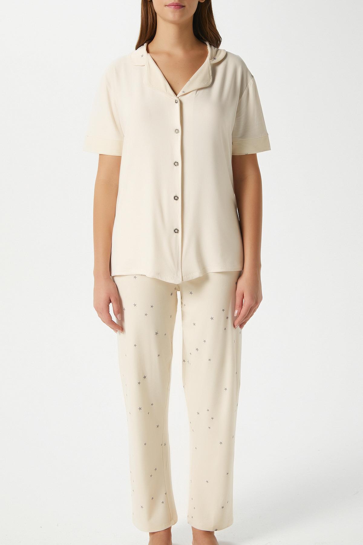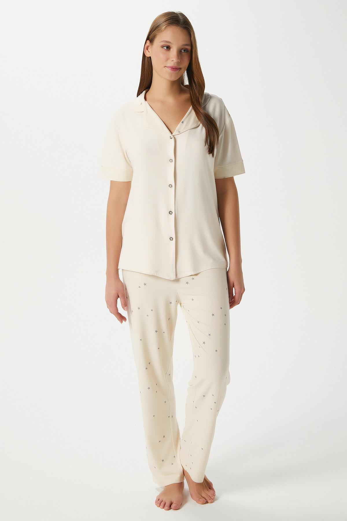 Kadın Star Yumuşak Doku Tereyağ Sarısı Yıldızlı Ön Düğmeli Kısa Kollu Pijama Takımı