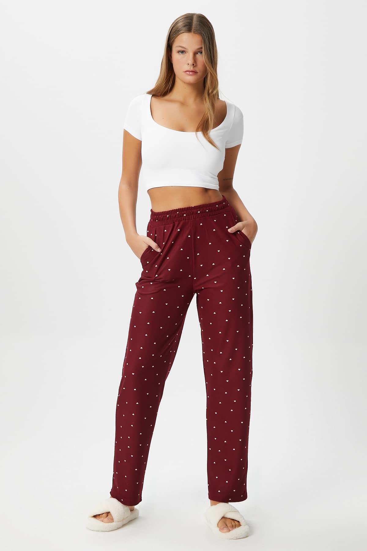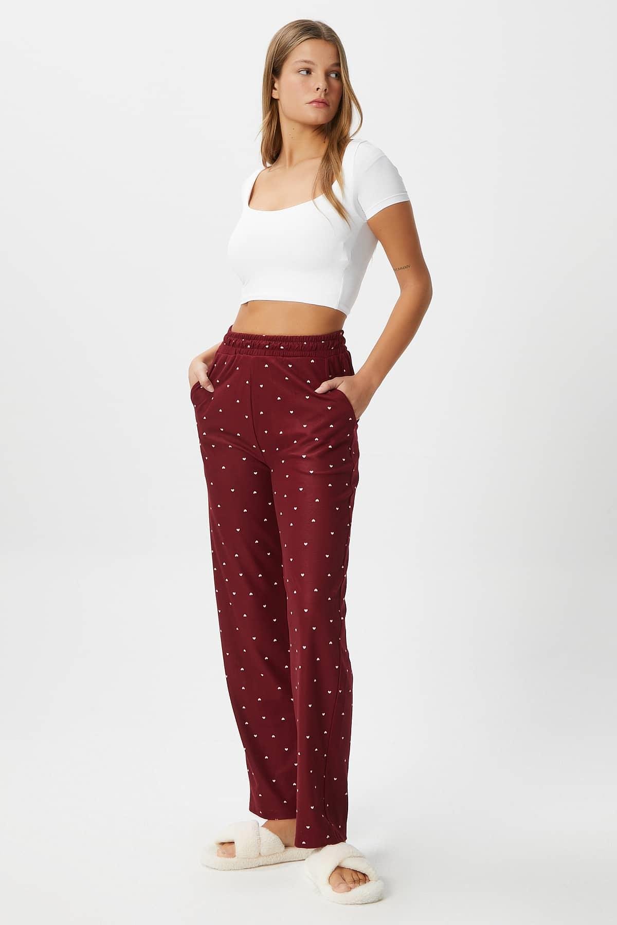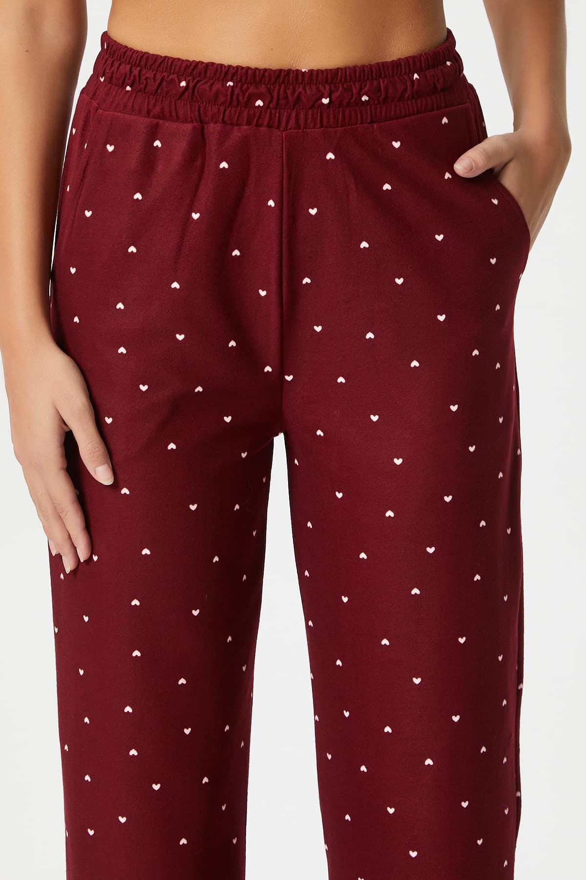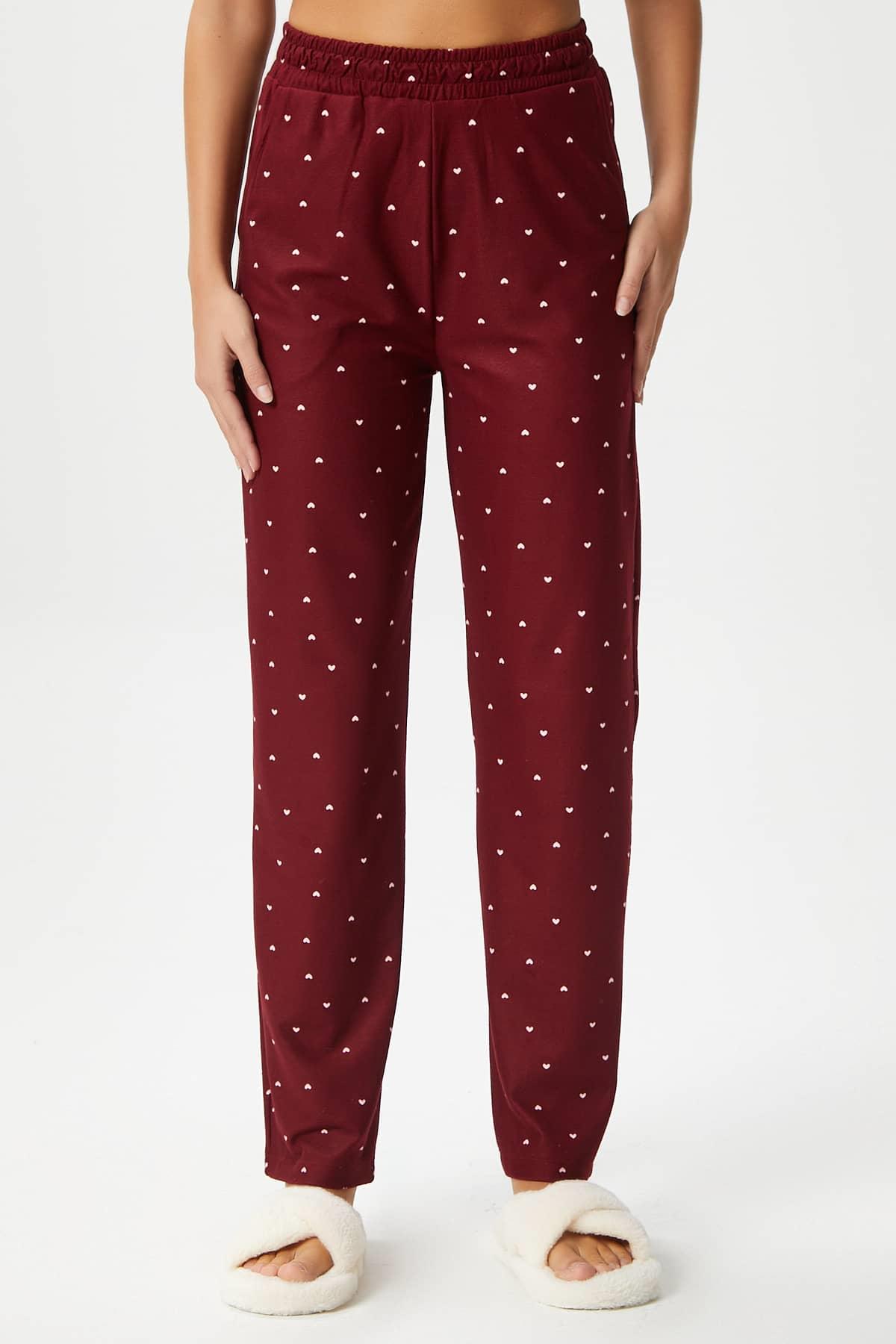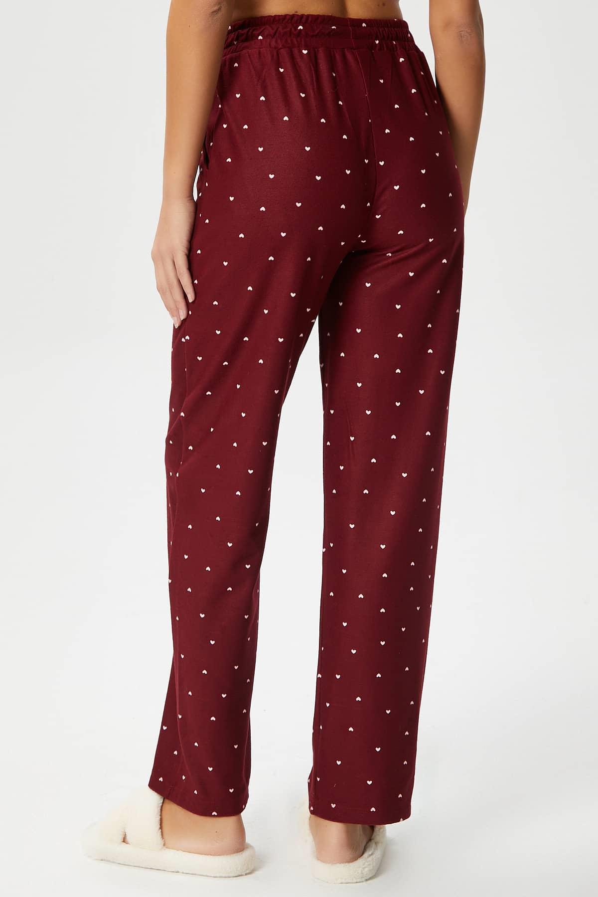 Kadın Teddi Ultra Yumuşak Cepli Bordo Kalp Desen Yılbaşı Pijama Altı