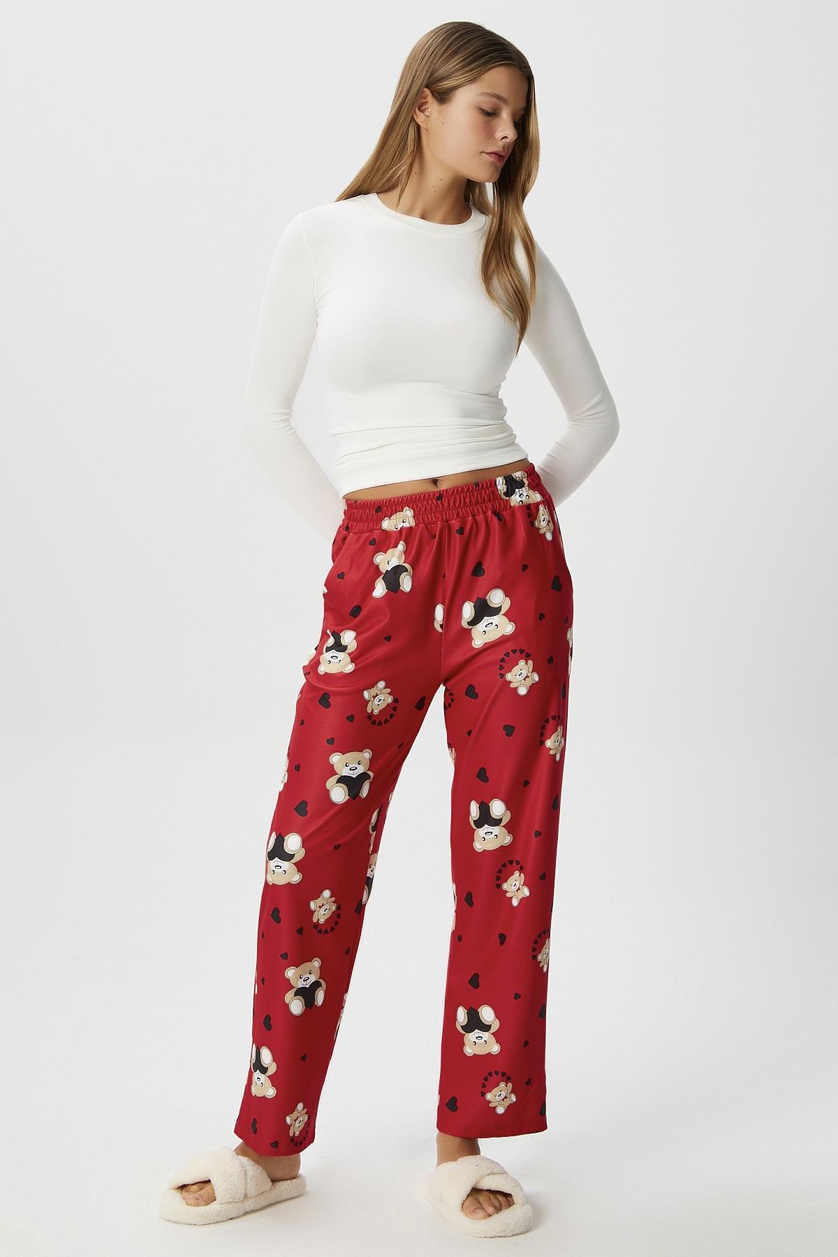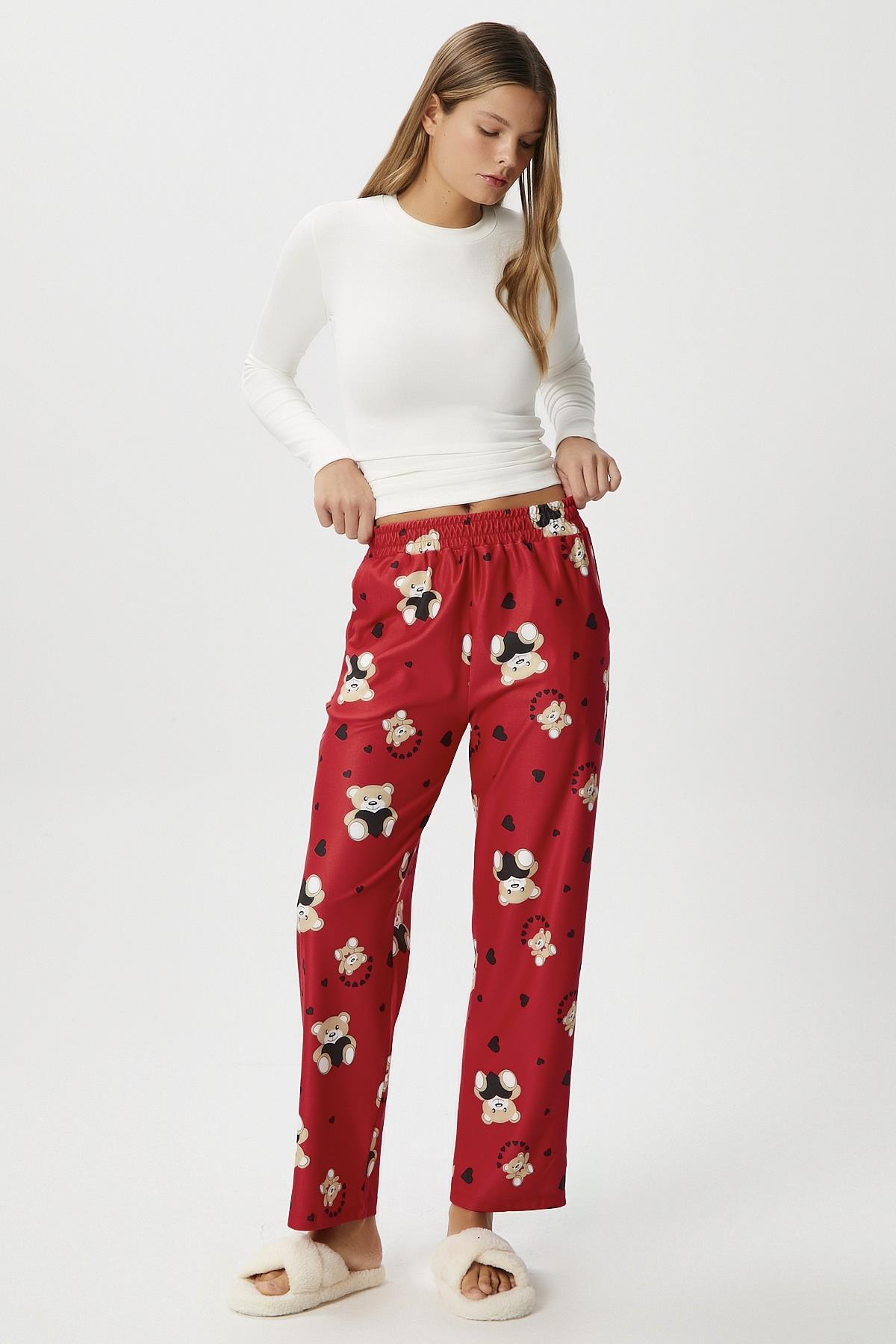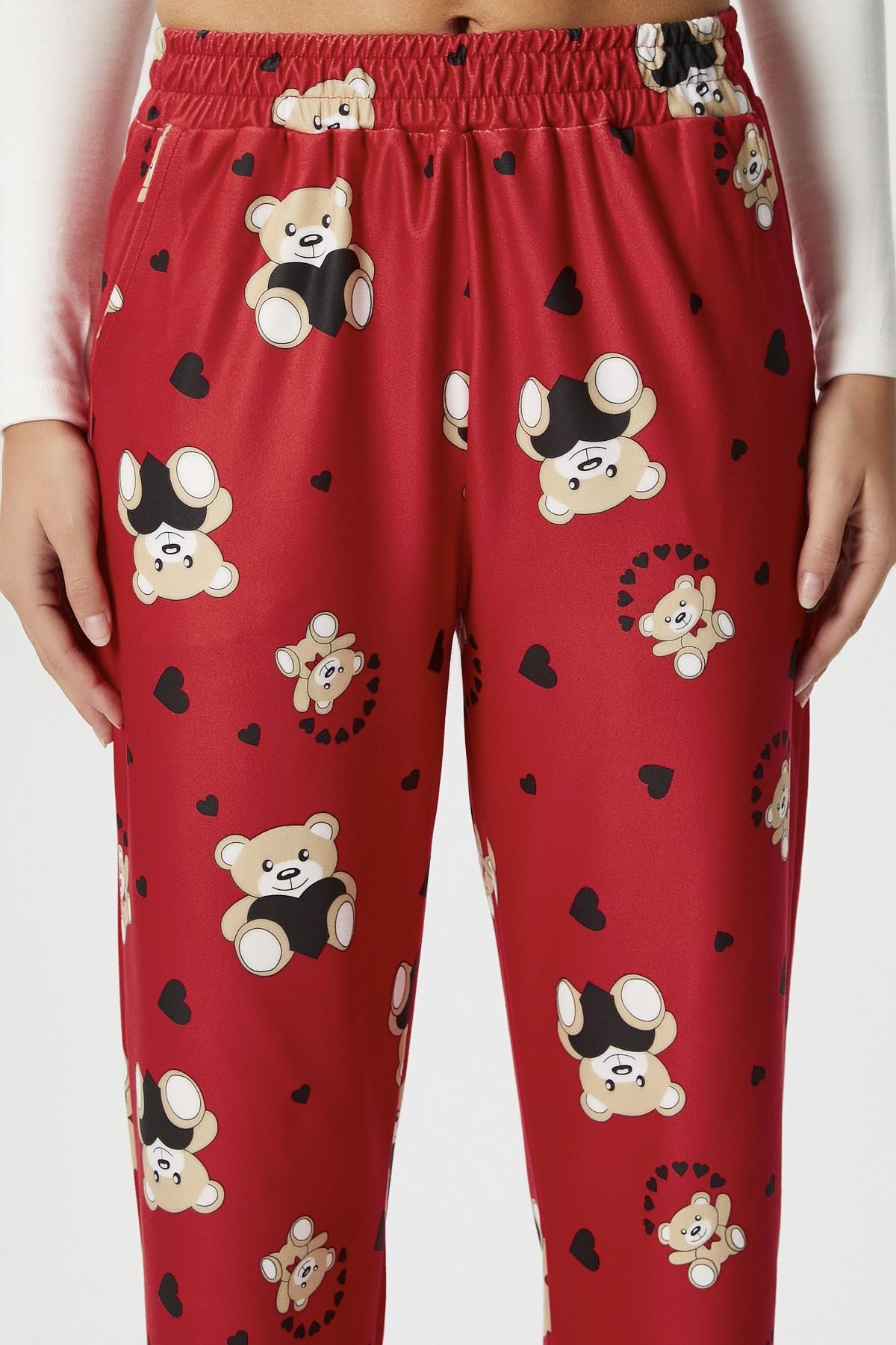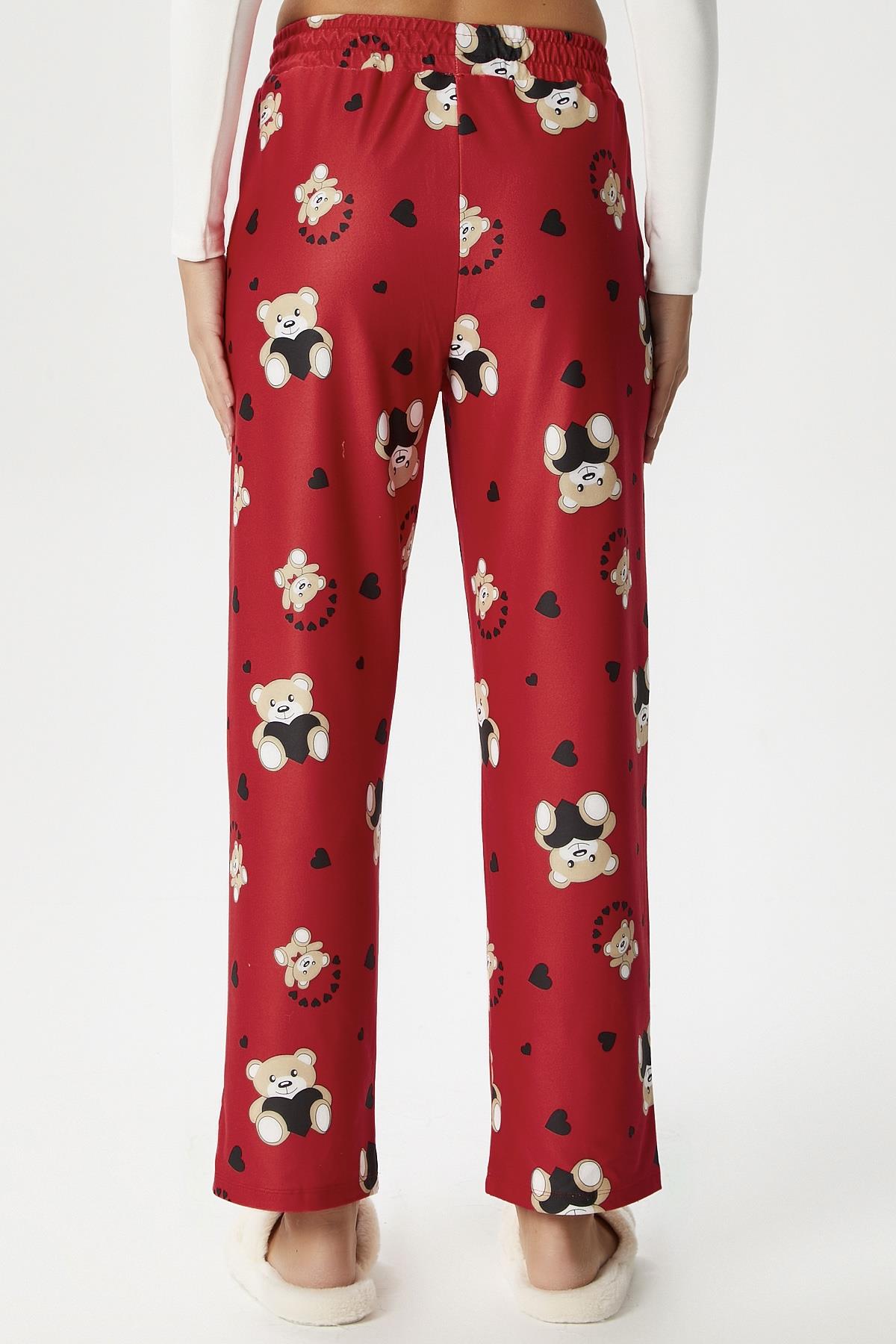 Kadın Teddi Ultra Yumuşak Cepli Kırmızı Ayıcık Desen Yılbaşı Pijama Altı