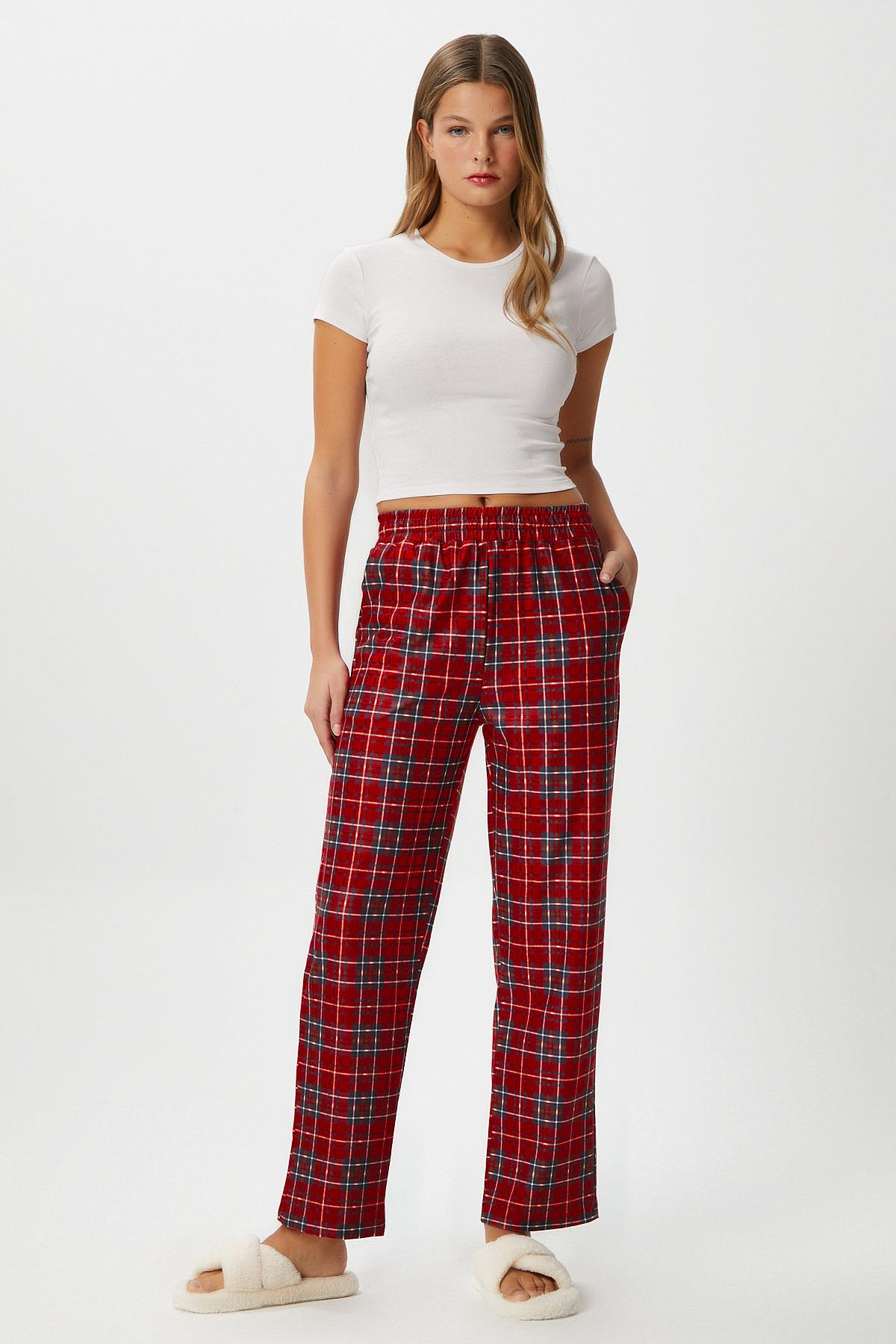 Kadın Teddi Ultra Yumuşak Cepli Kırmızı Ekose Desen Yılbaşı Pijama Altı