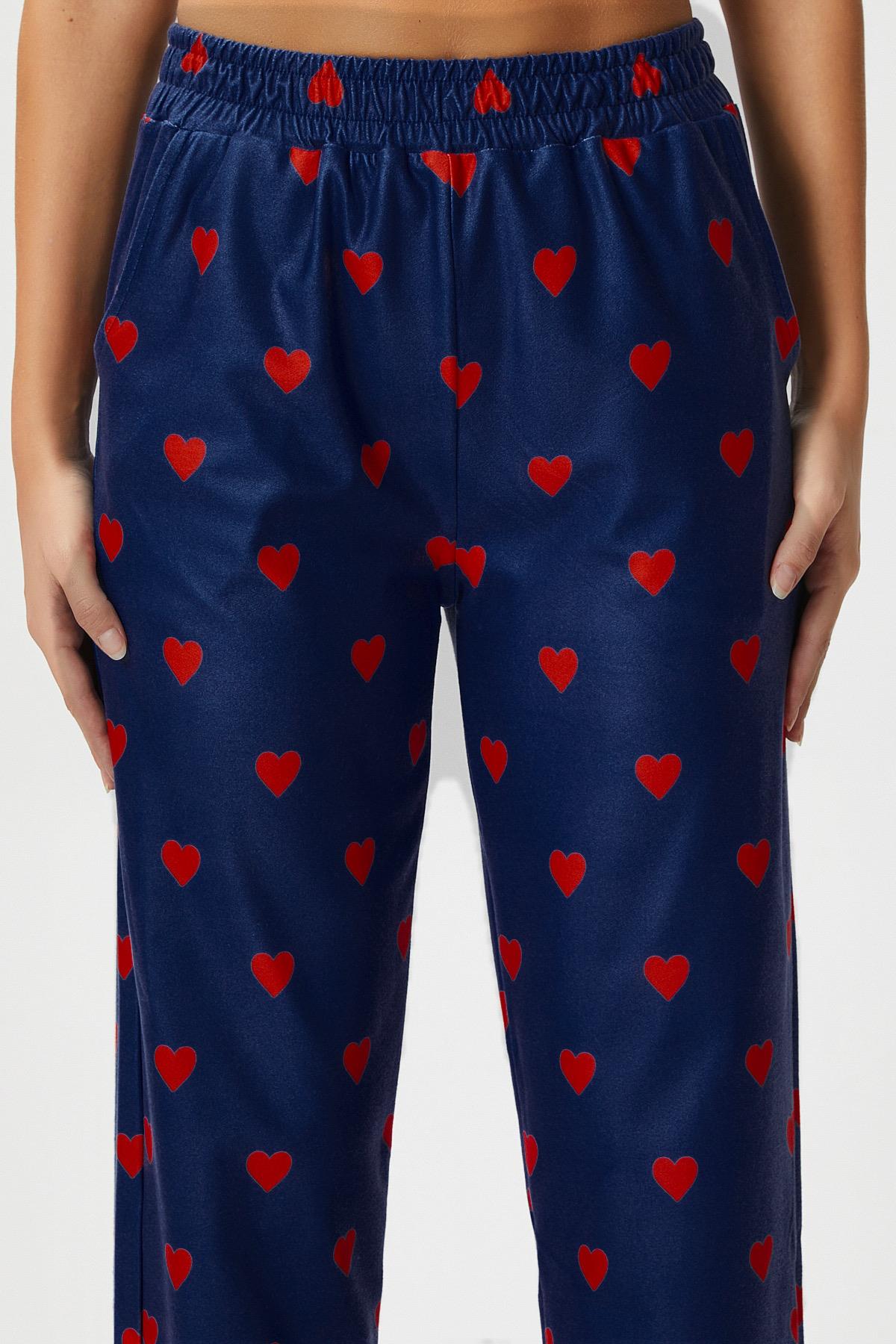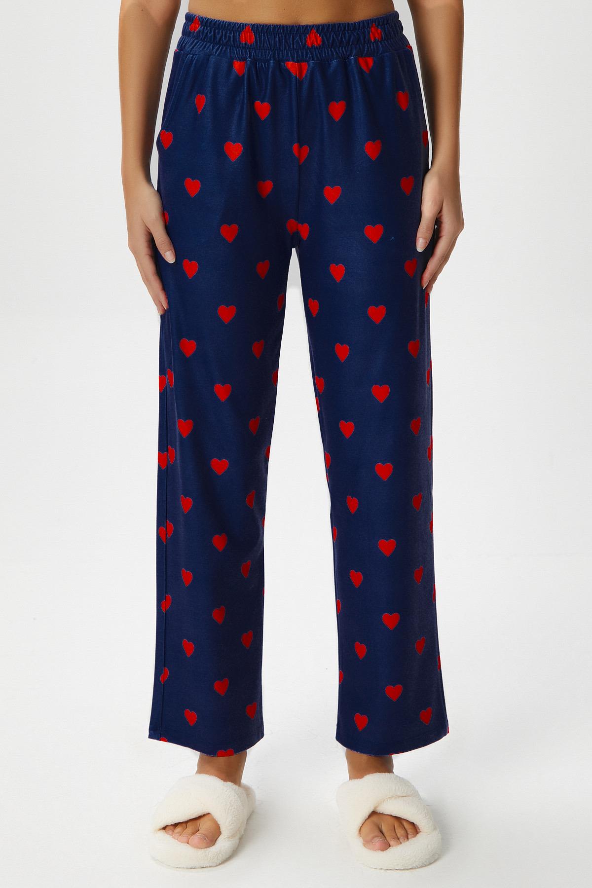 Kadın Teddi Ultra Yumuşak Cepli Lacivert Kalp Desen Yılbaşı Pijama Altı
