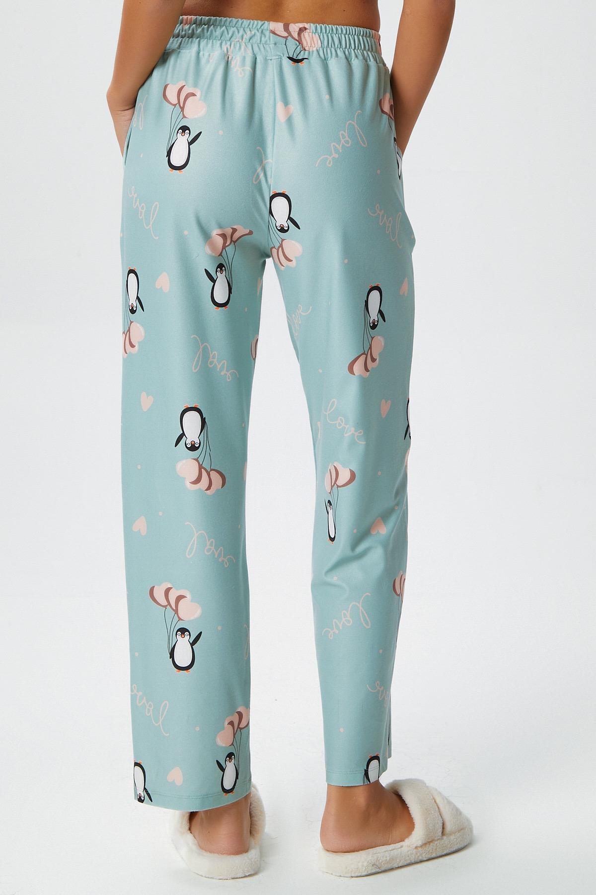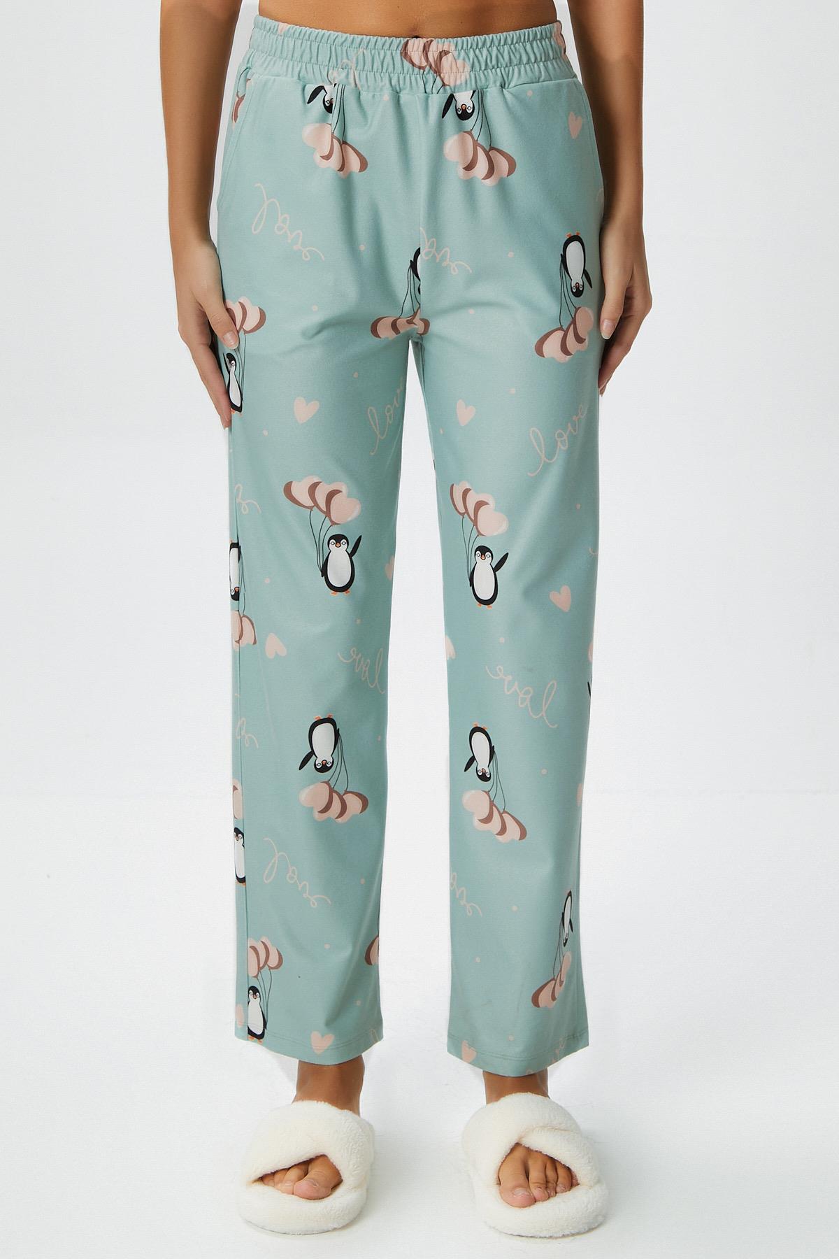 Kadın Teddi Ultra Yumuşak Cepli Mint Penguen Desen Yılbaşı Pijama Altı