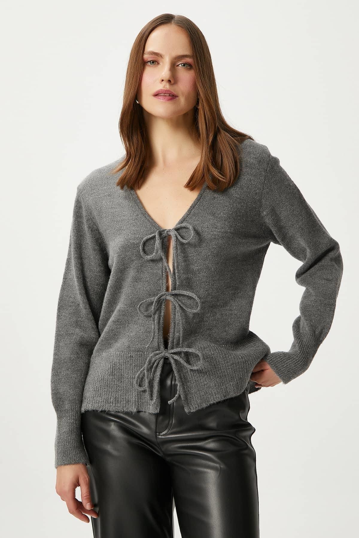 Kadın Tena Bağcıklı Antrasit Triko Hırka