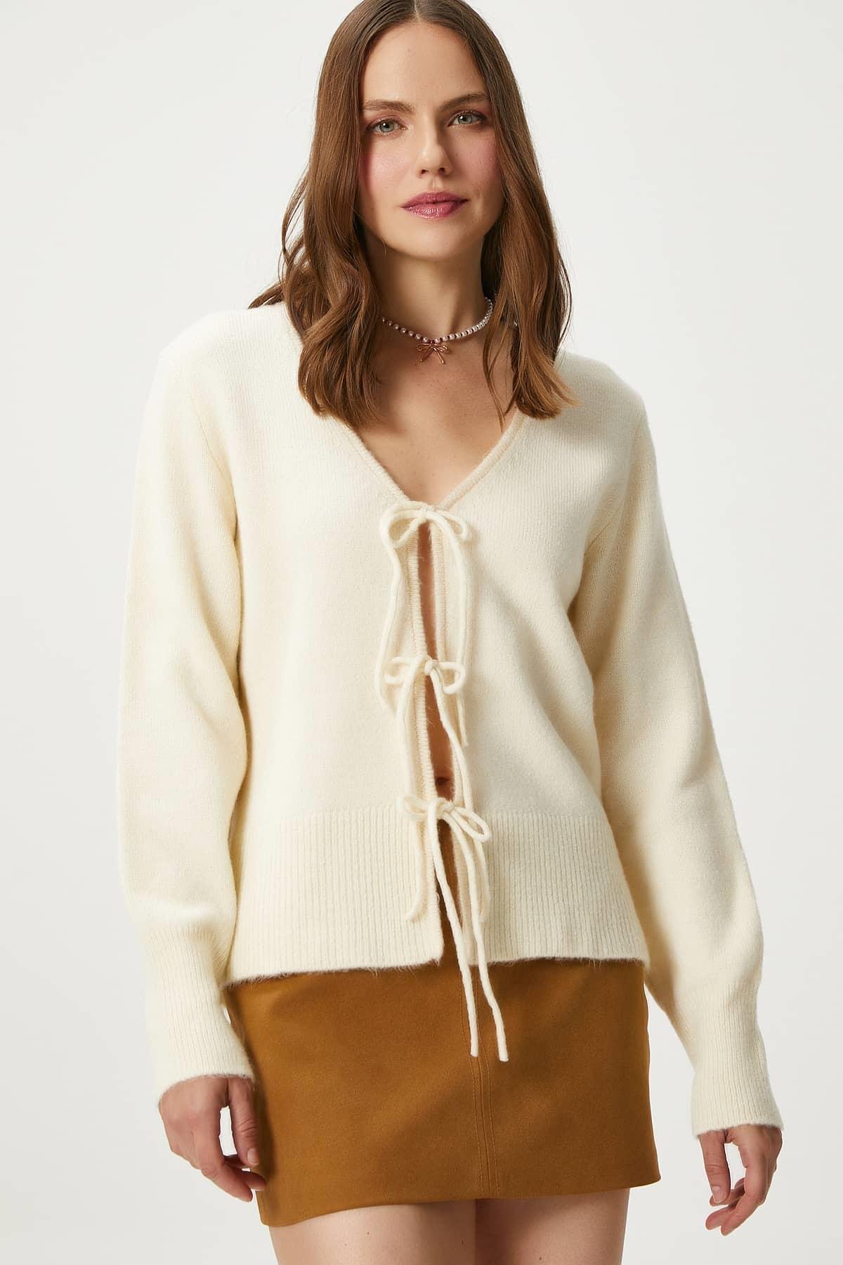 Kadın Tena Bağcıklı Krem Triko Hırka