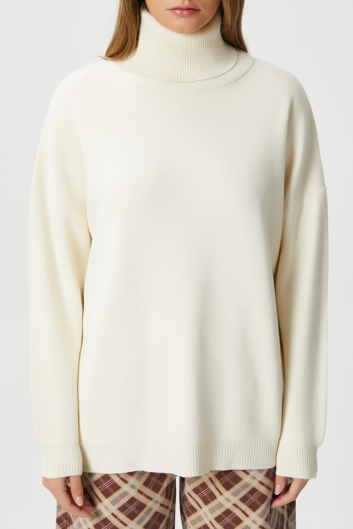 Kadın Teresa Balıkçı Yaka Oversize Triko KazakModel Boy 176 cm Göğüs 88 , Bel 62, Basen 93 cm