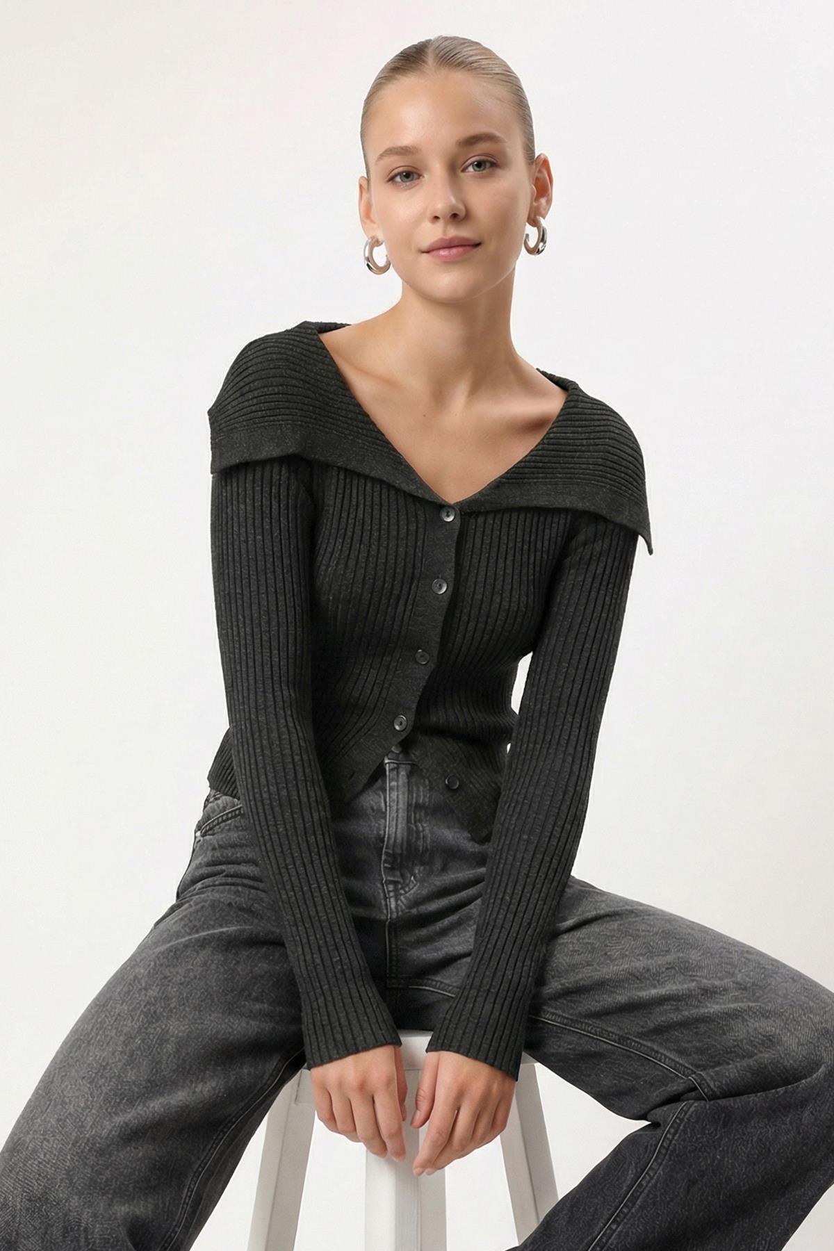 Kadın Terra Fitilli Düğmeli Antrasit Triko Hırka