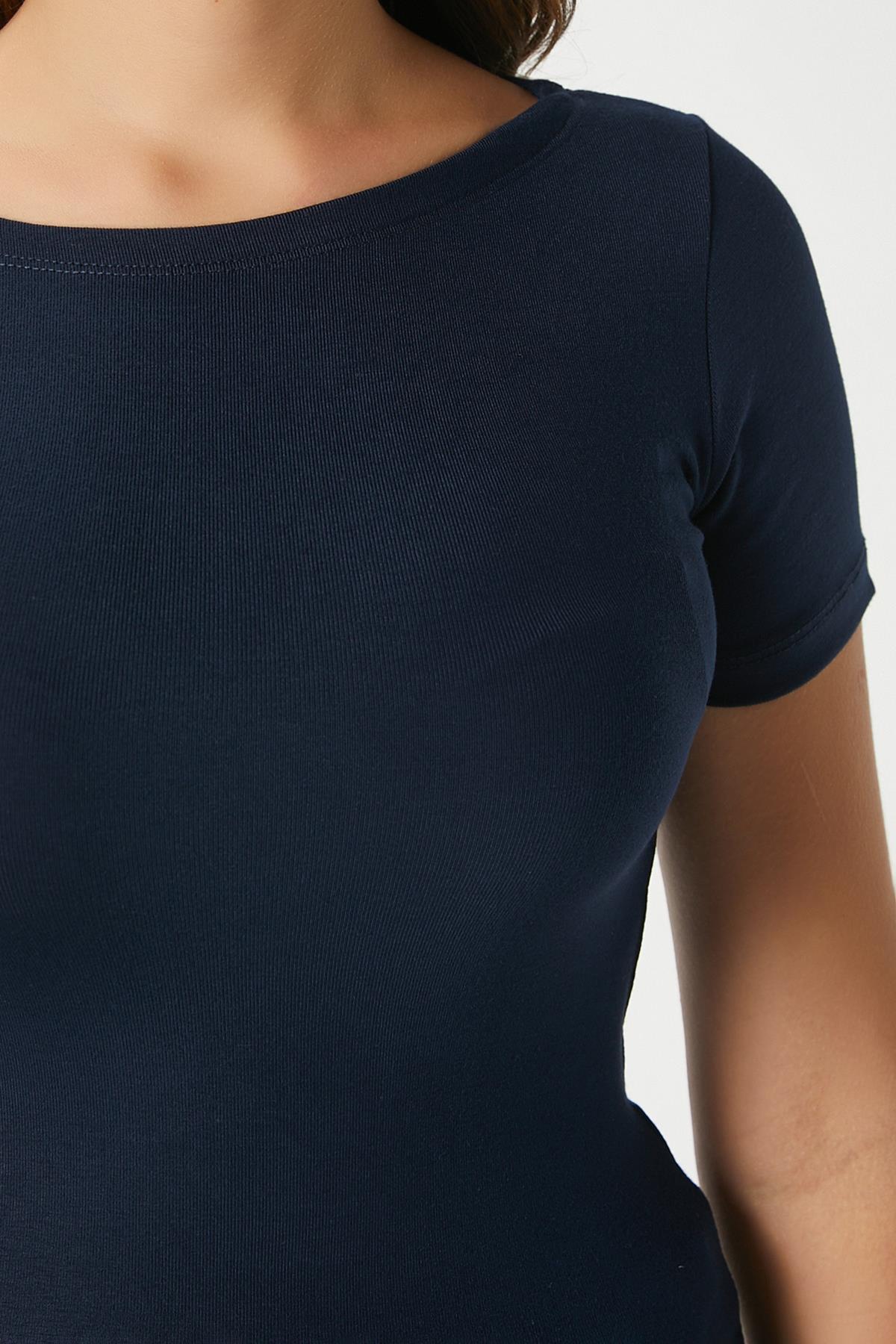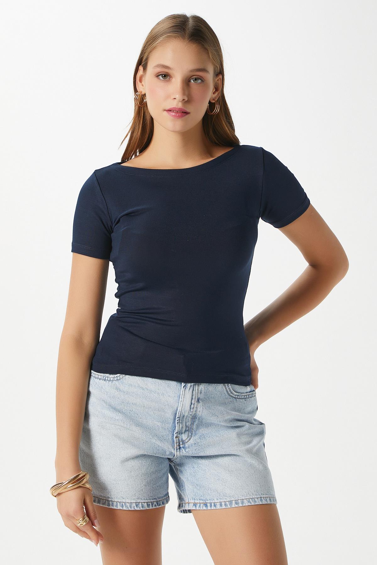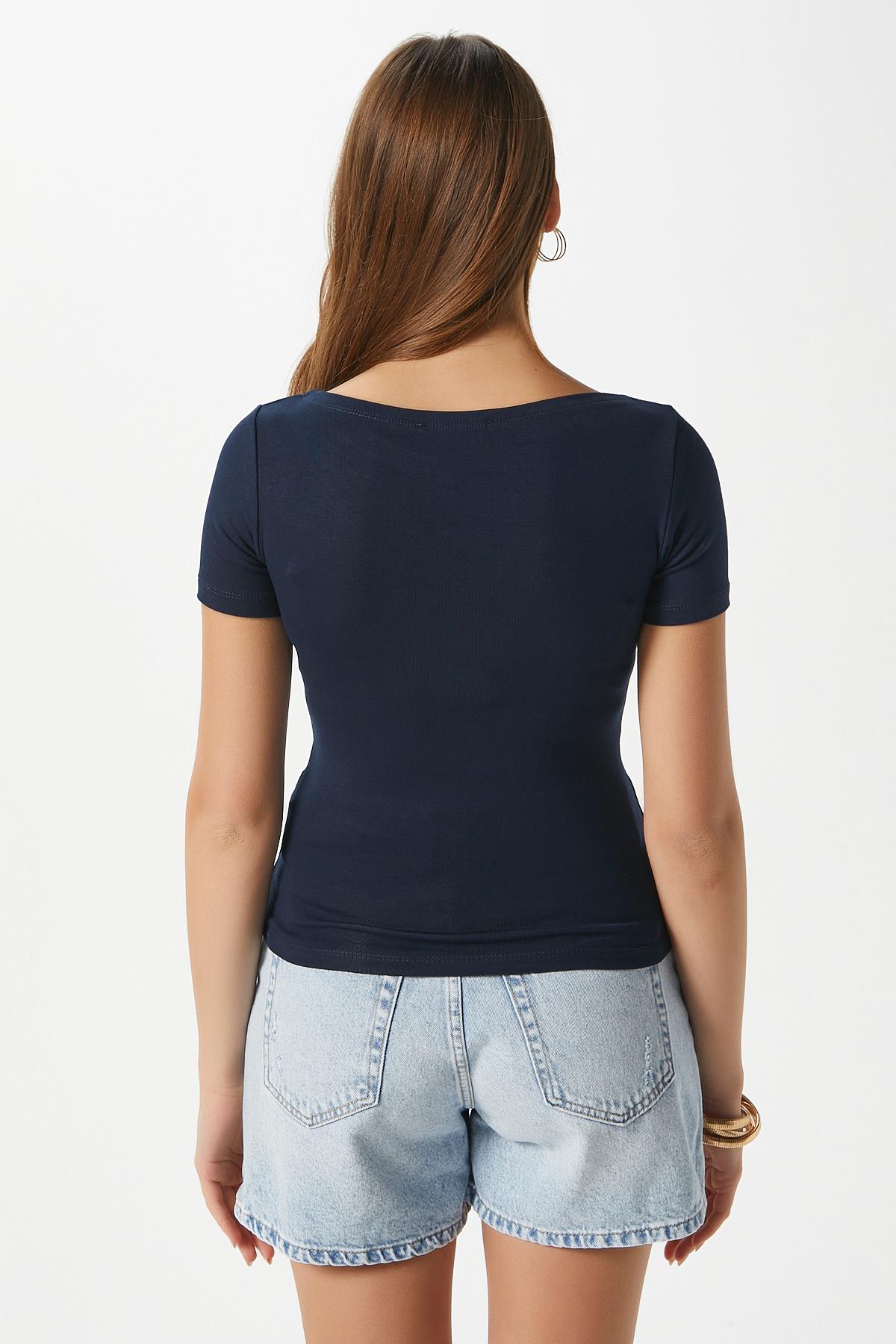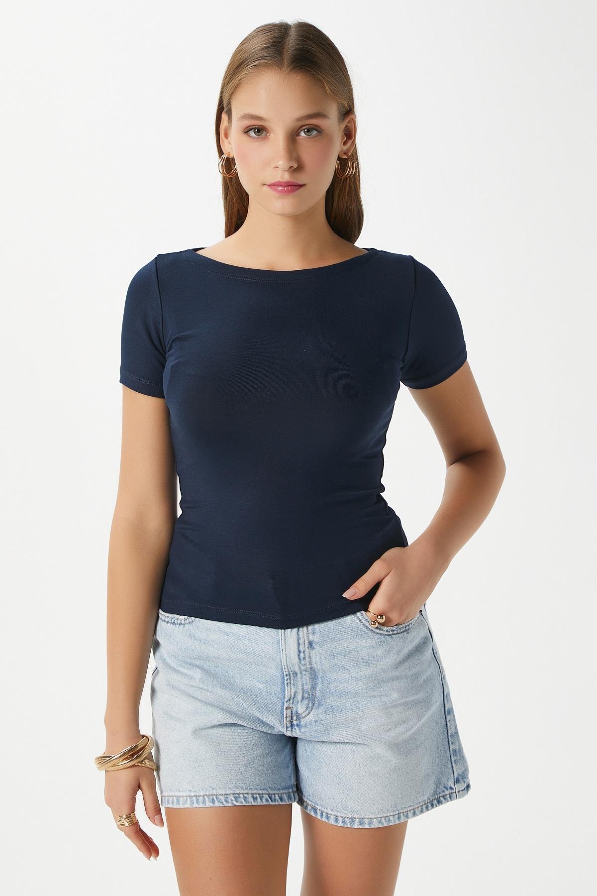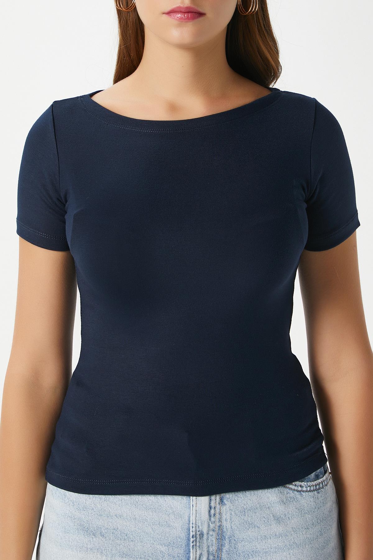 Kadın Velvet Kayık Yaka Lux Touch Yumuşak Doku Kısa Kol Lacivert Bluz