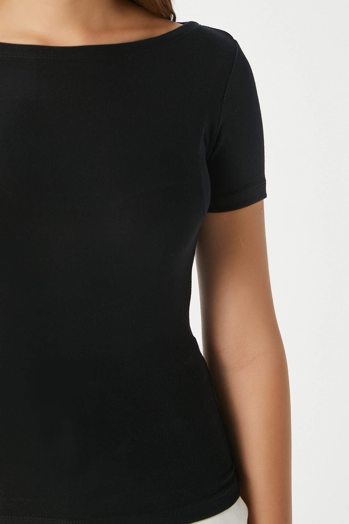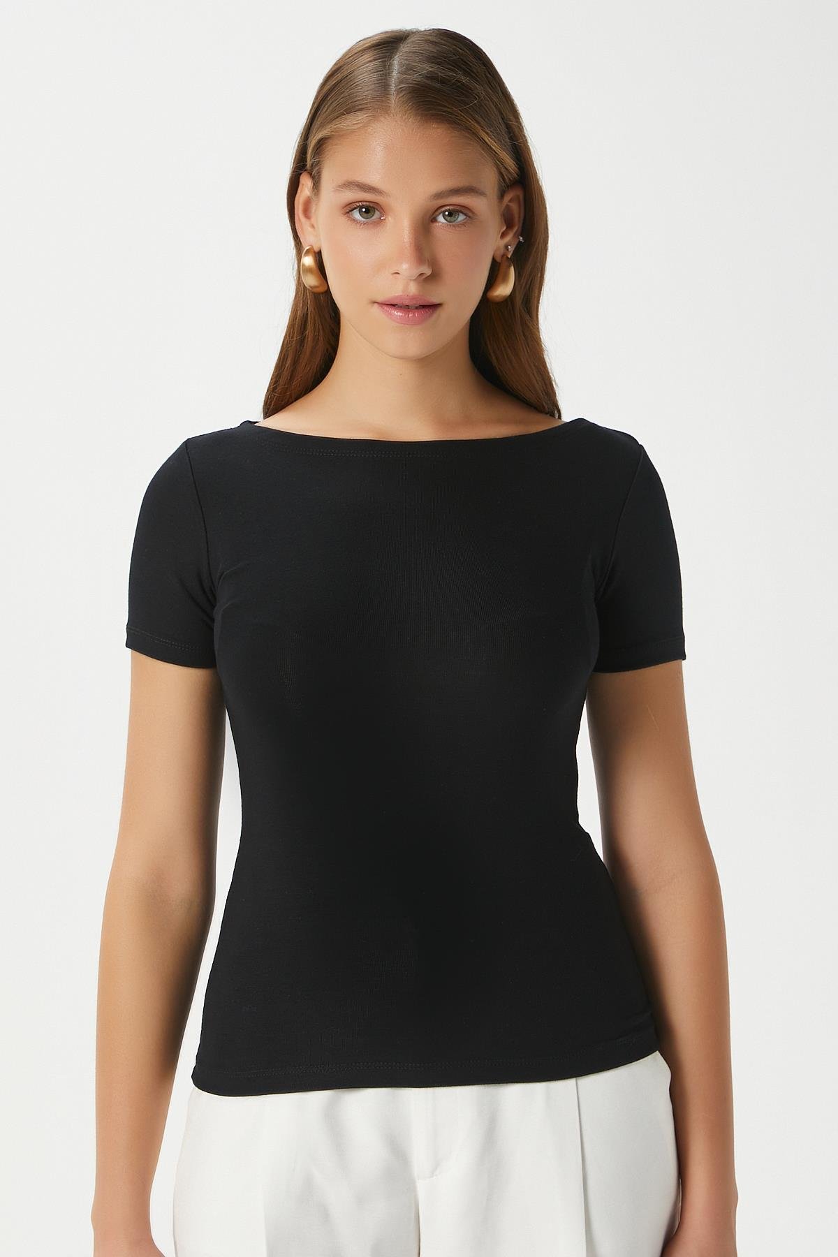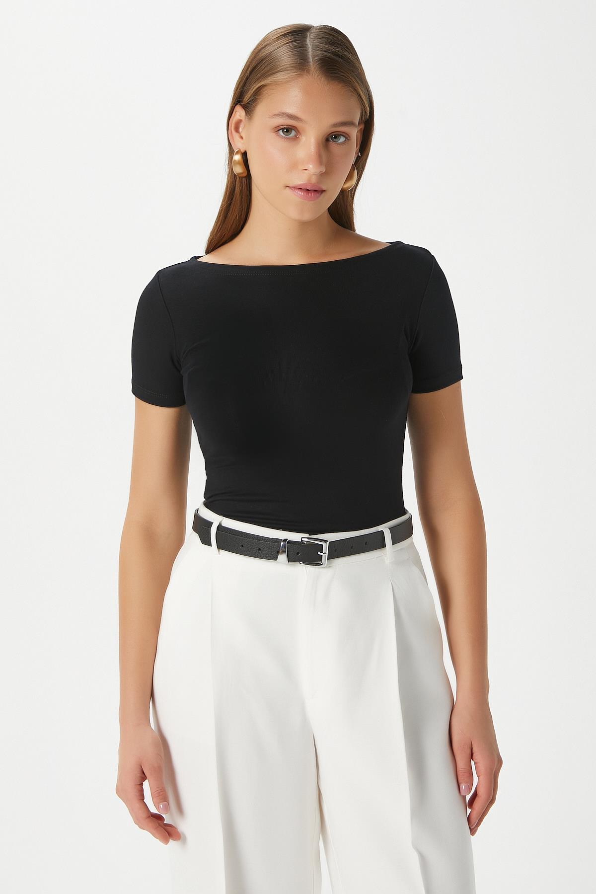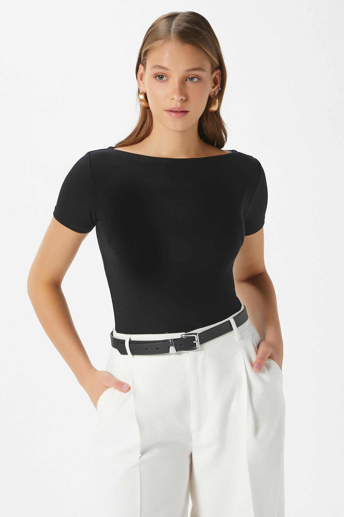 Kadın Velvet Kayık Yaka Lux Touch Yumuşak Doku Kısa Kol Siyah Bluz