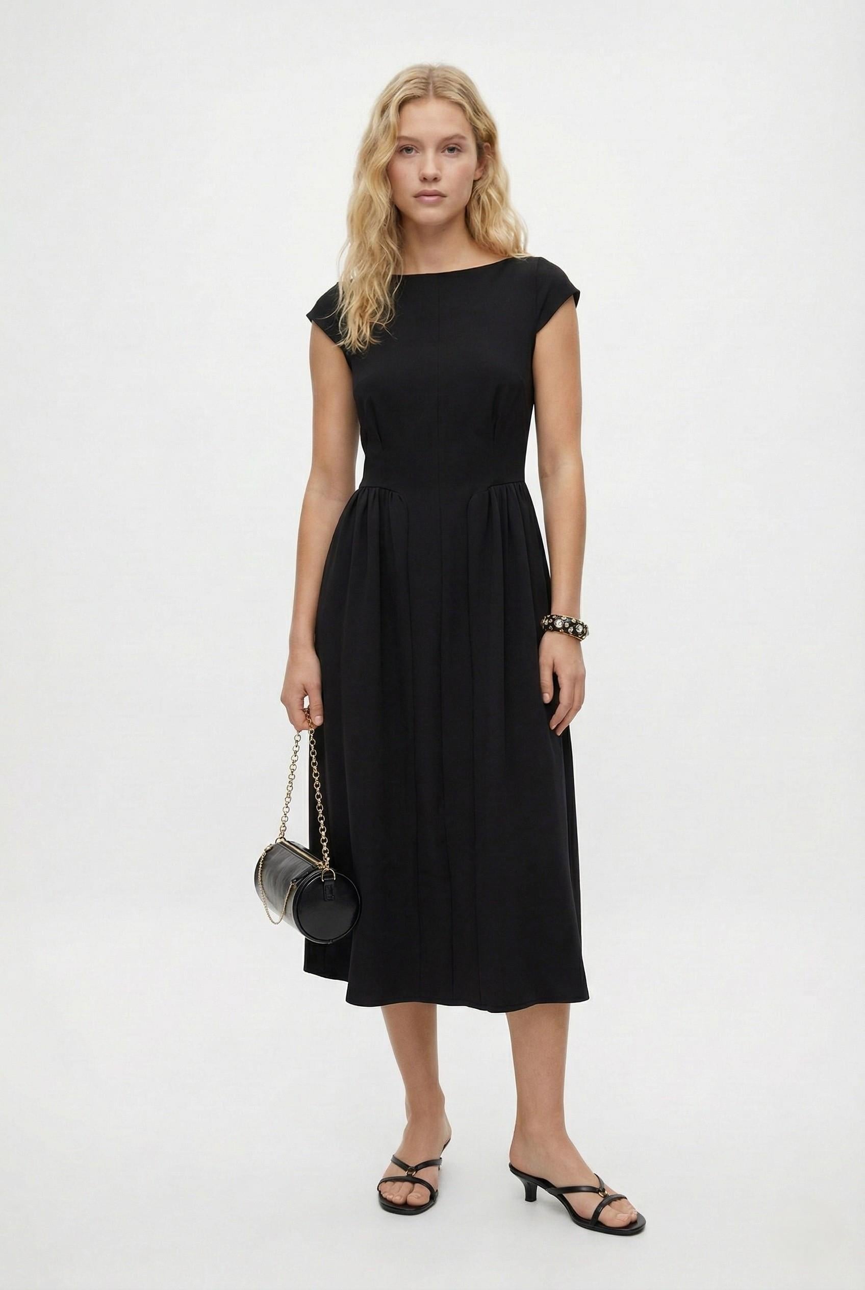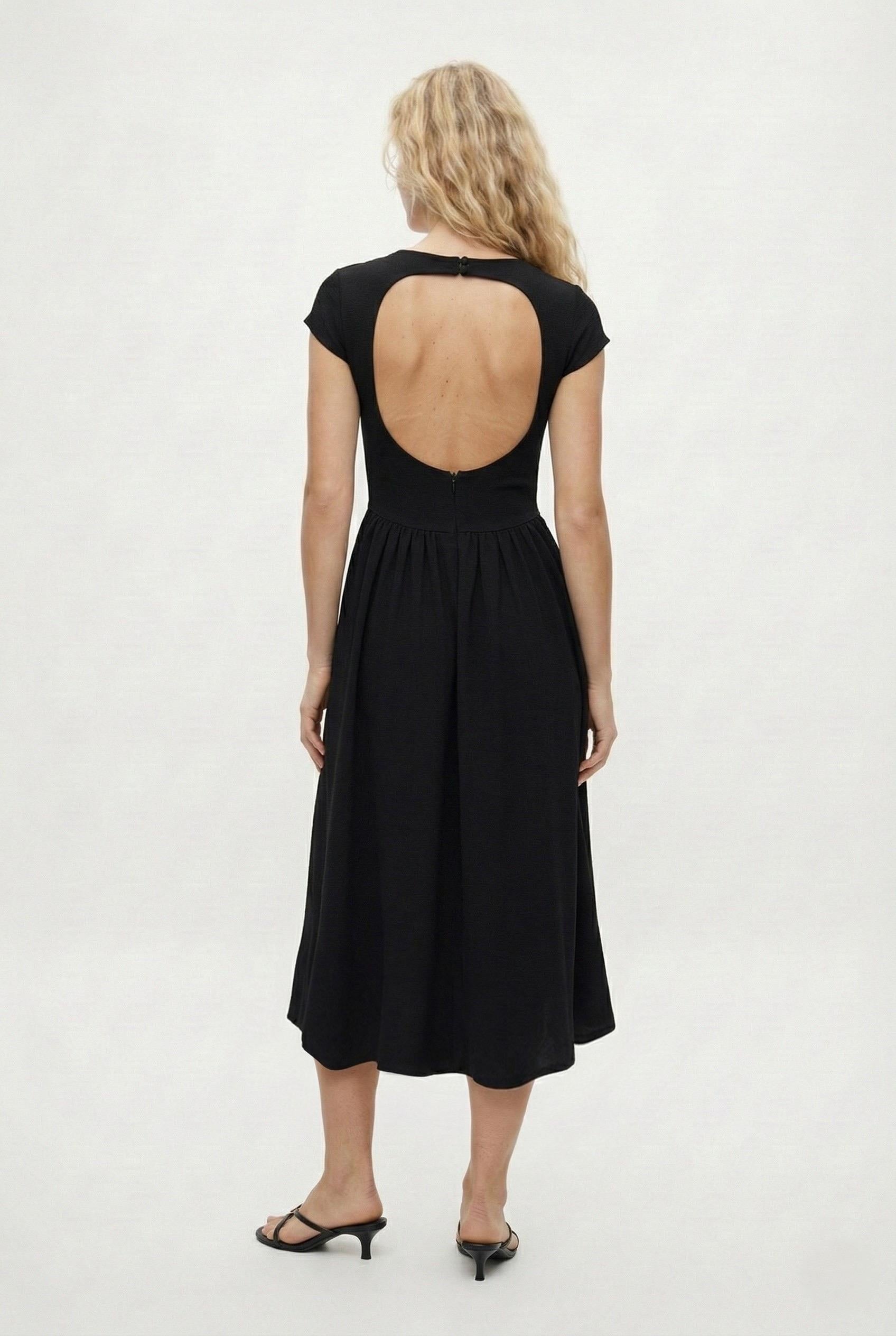 Kadın Verano Astarlı Sırt Dekolteli Kayık Yaka Midi Dokuma Siyah Elbise