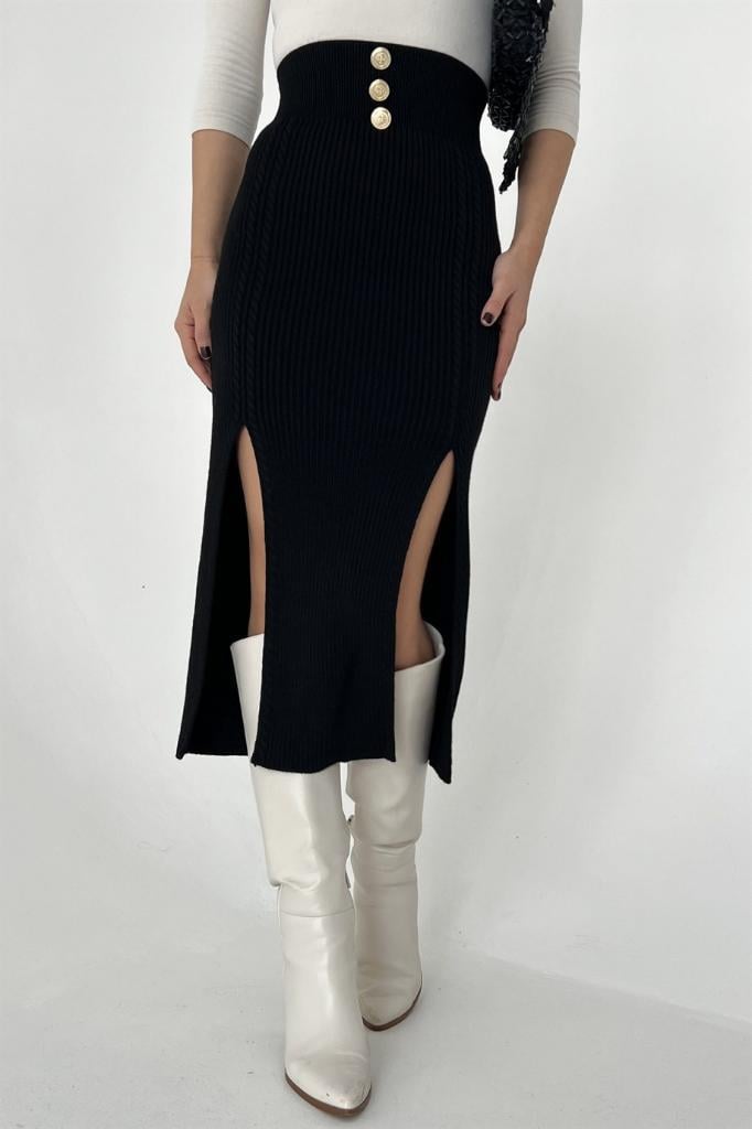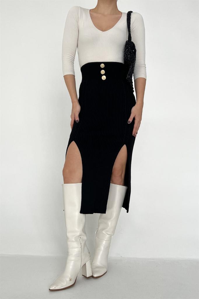 Kadın Siyah Yırtmaç Detaylı Gold Düğmeli Triko EtekModel boy 170 cm Kilo 53kgEtek boy :84 cmStandart beden