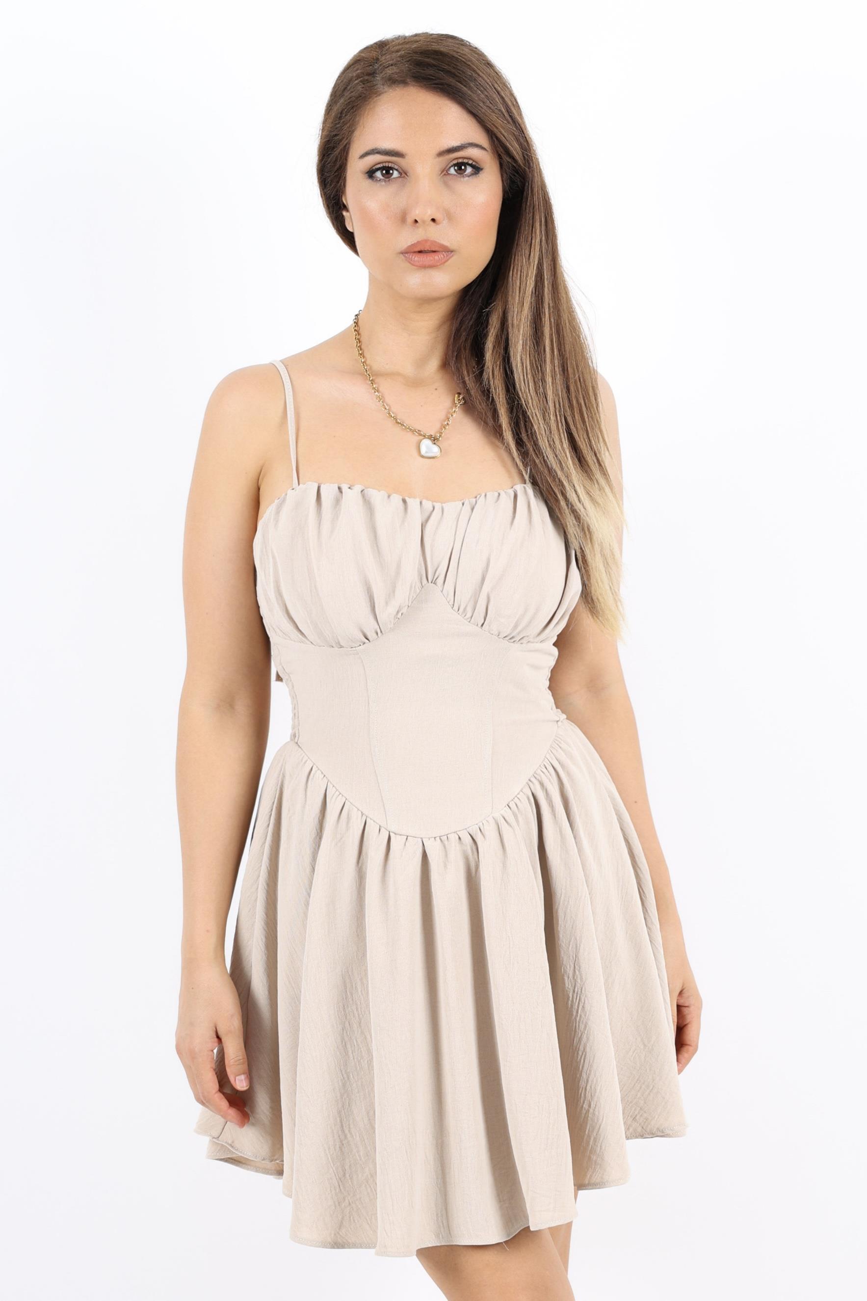 Korse Görünümlü Astarlı Sırt Lastik Detay Bej Kısa Elbise