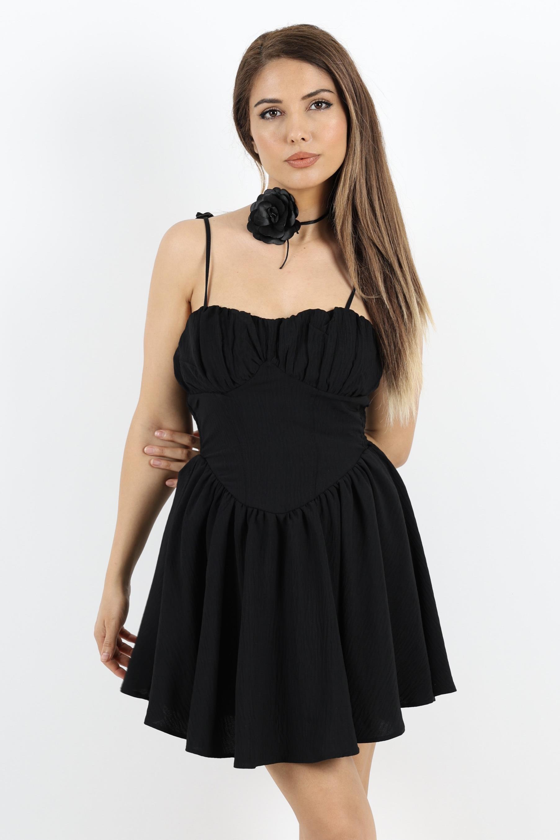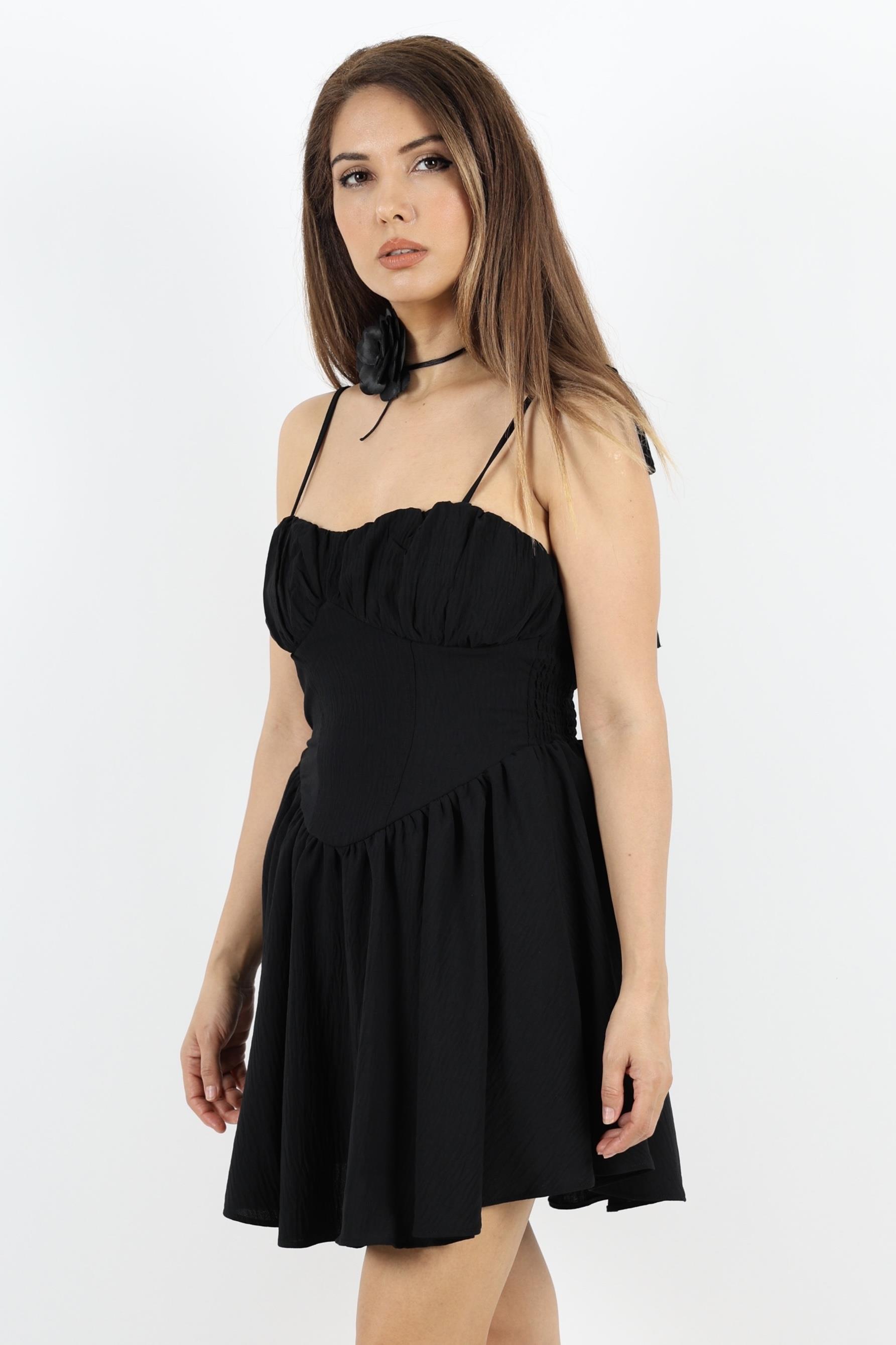 Korse Görünümlü Astarlı Sırt Lastik Detay Siyah Kısa Elbise