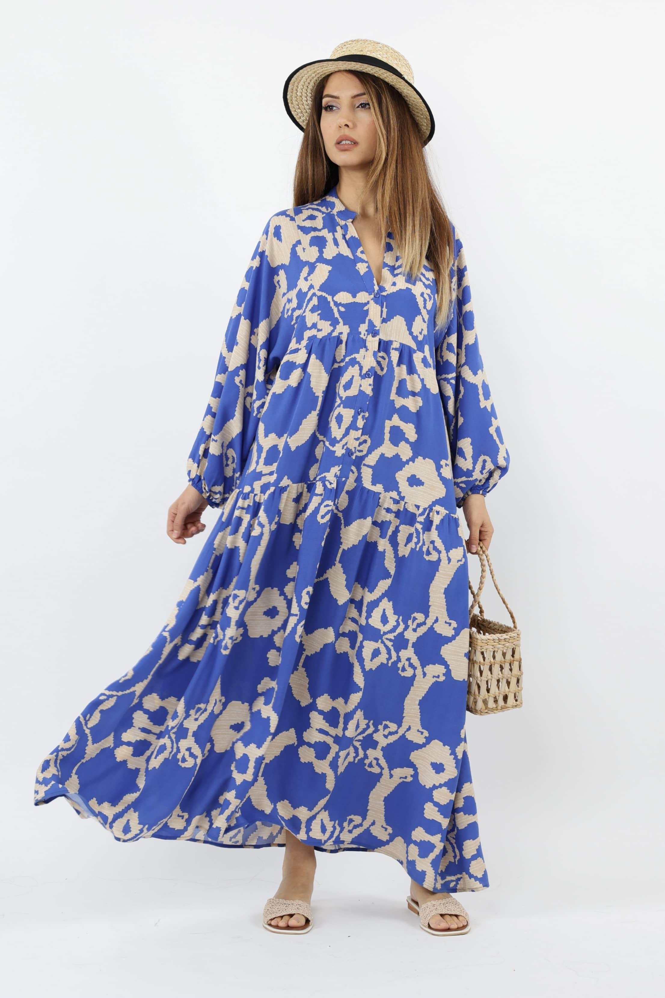 Prive Kadın Chain %100 Viskon Maksi Boy Mavi Balon Kol Uzun Yazlık Elbise