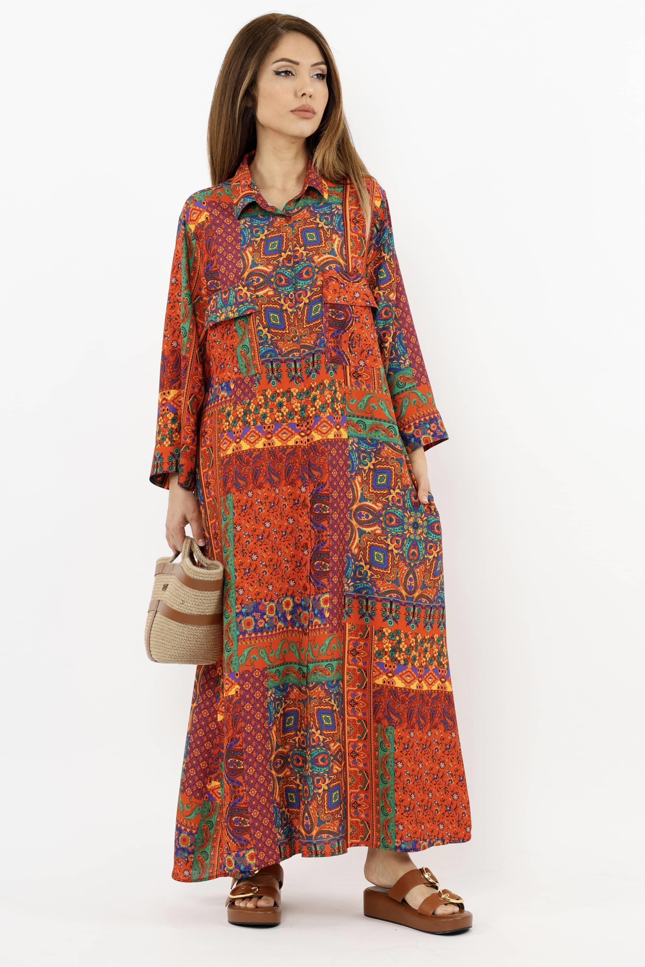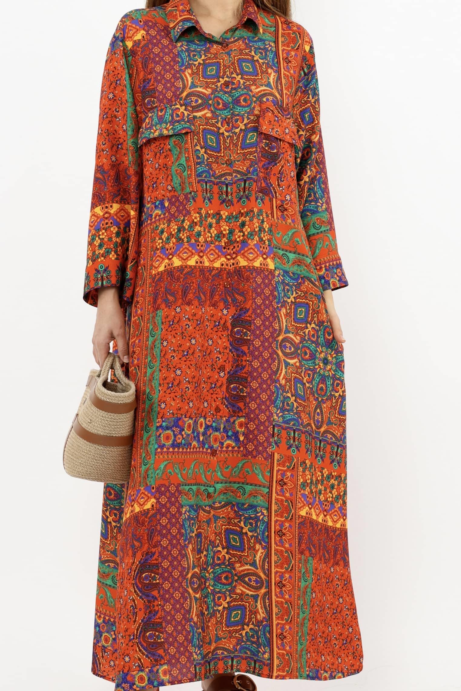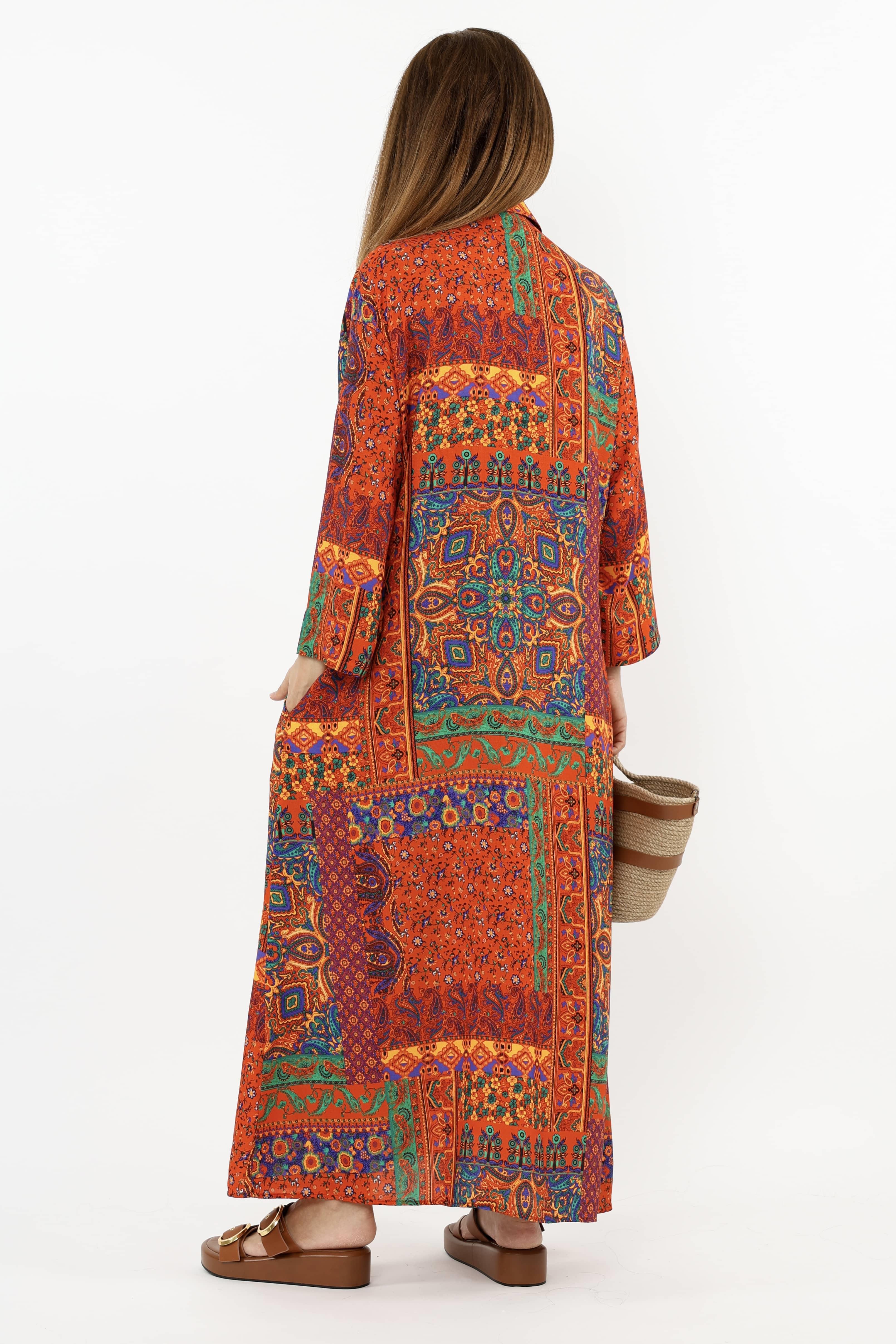 Prive Kadın Etnik %100 Viskon Kırmızı Gömlek Yaka Önden Düğmeli Uzun Yazlık Elbise