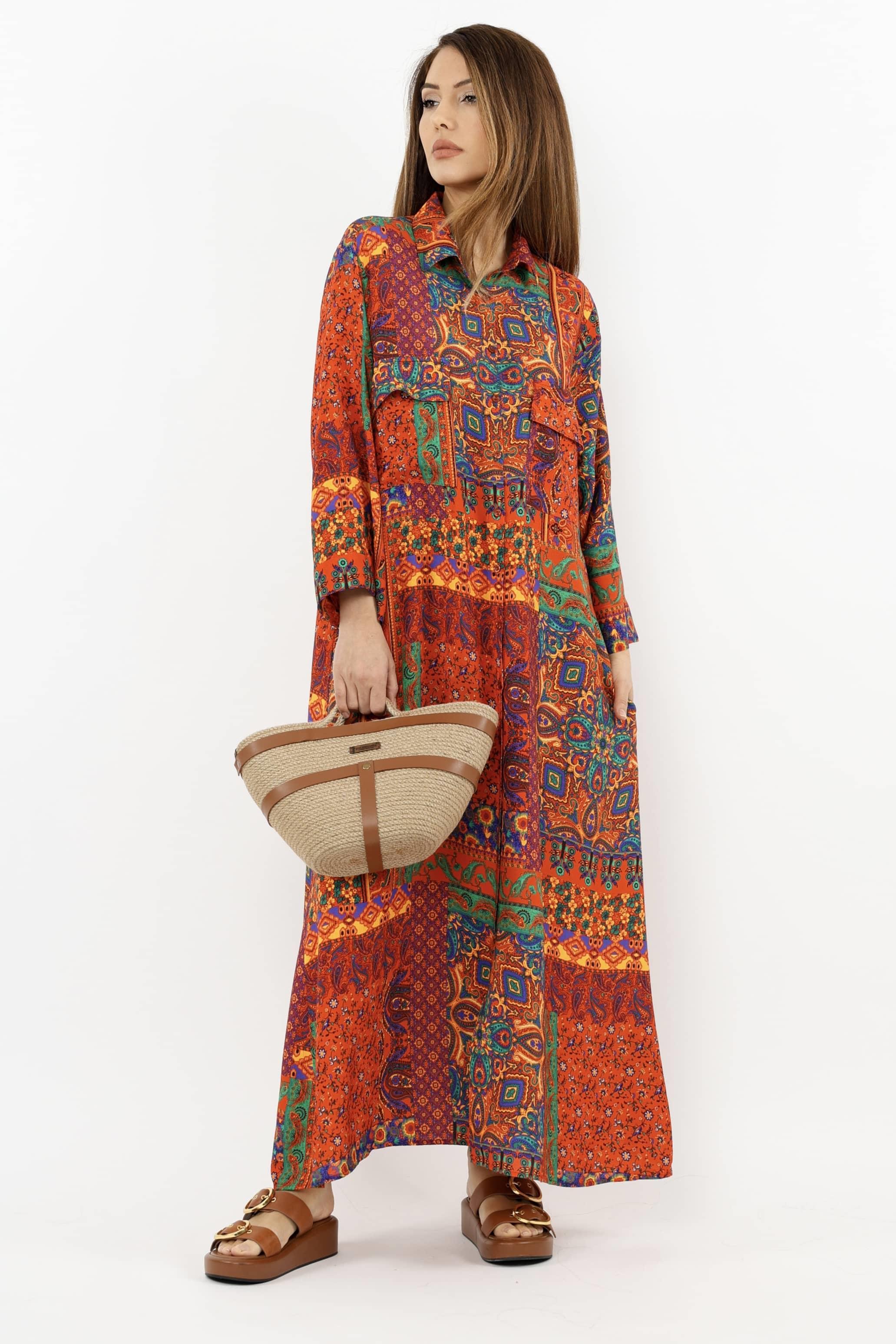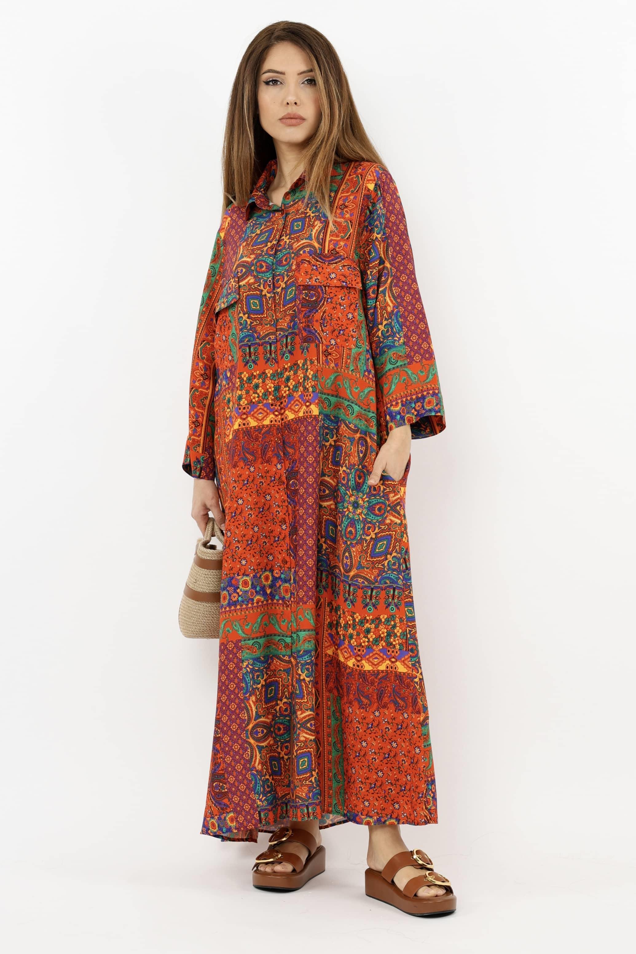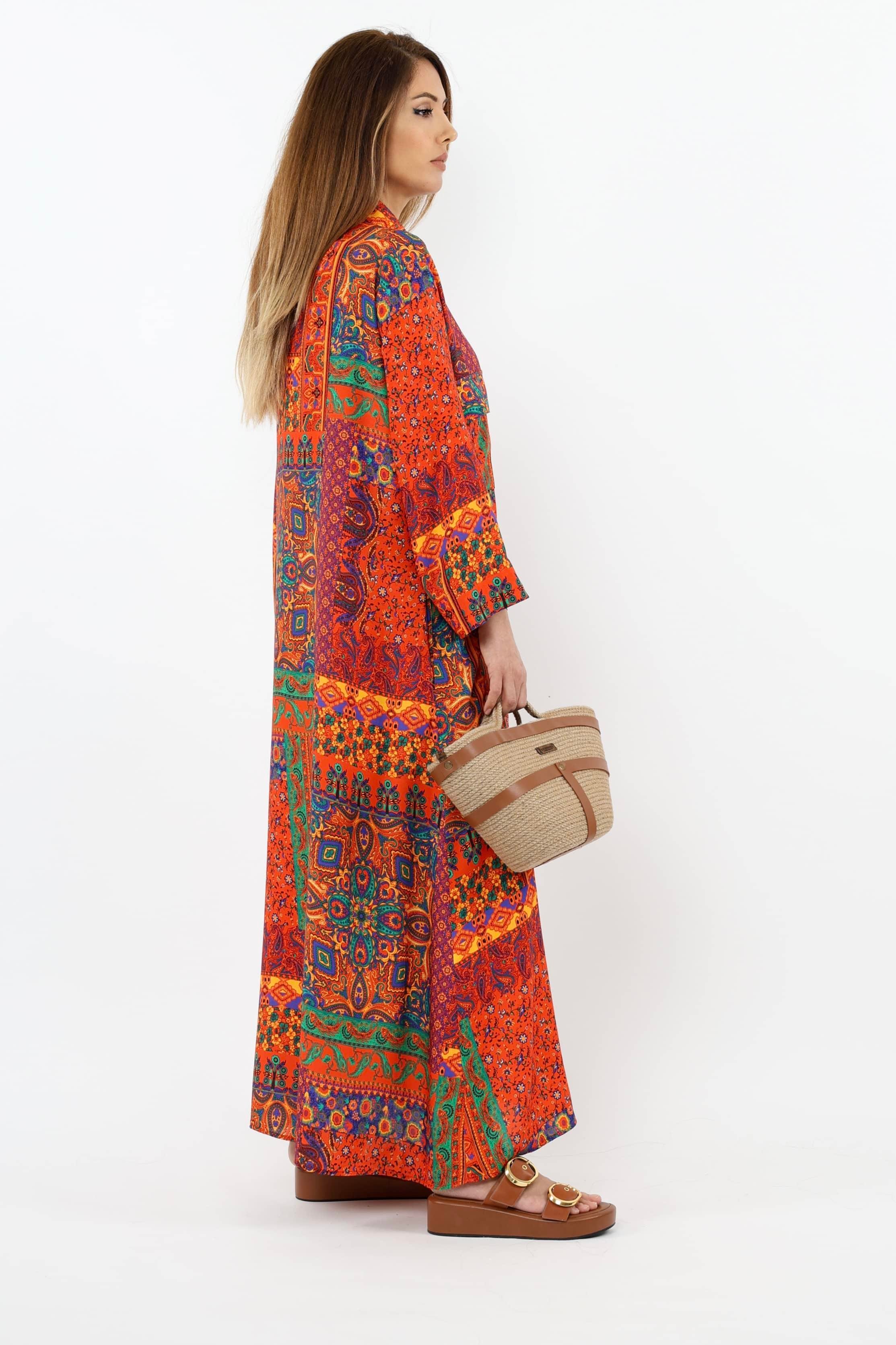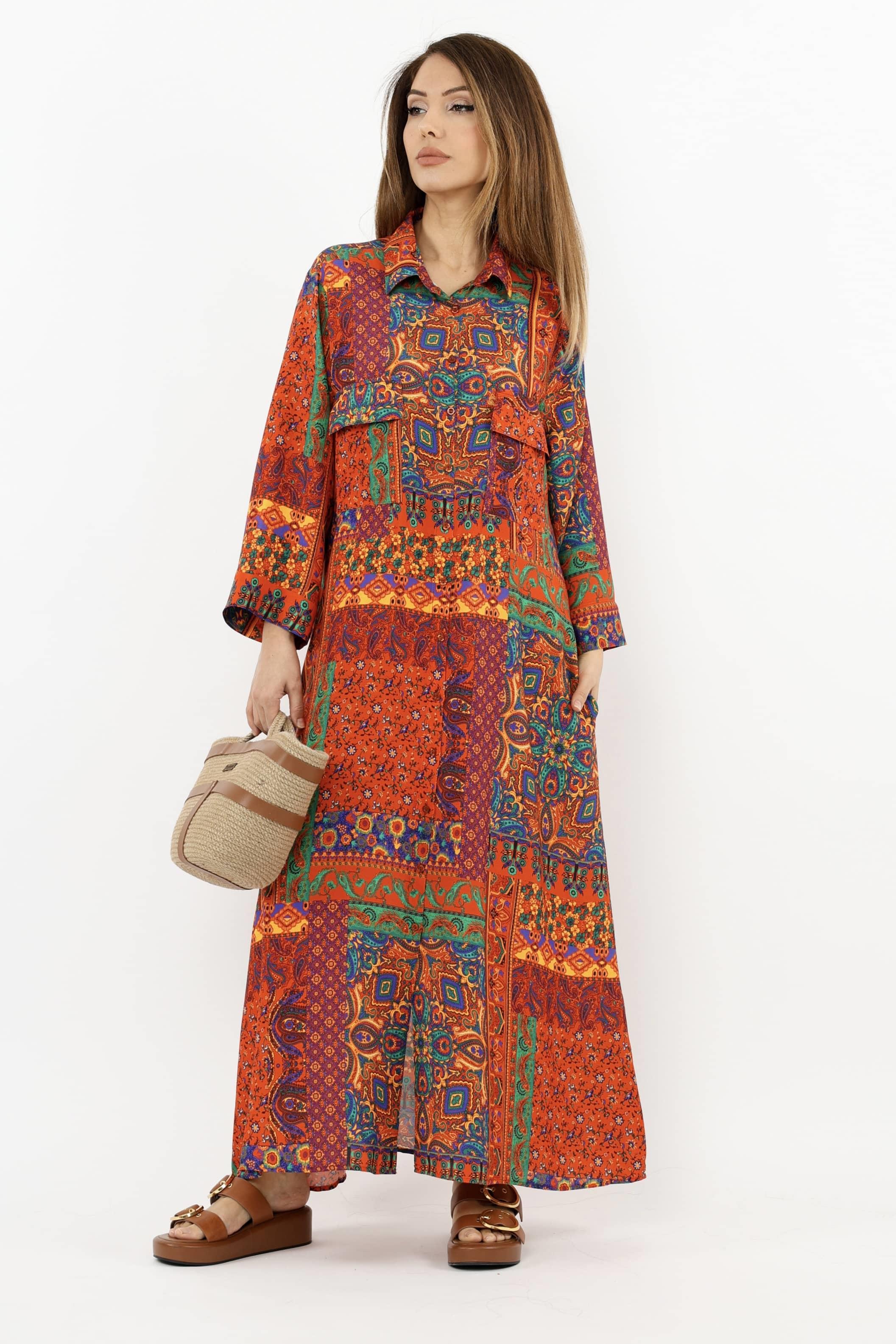 Prive Kadın Etnik %100 Viskon Kırmızı Gömlek Yaka Önden Düğmeli Uzun Yazlık Elbise