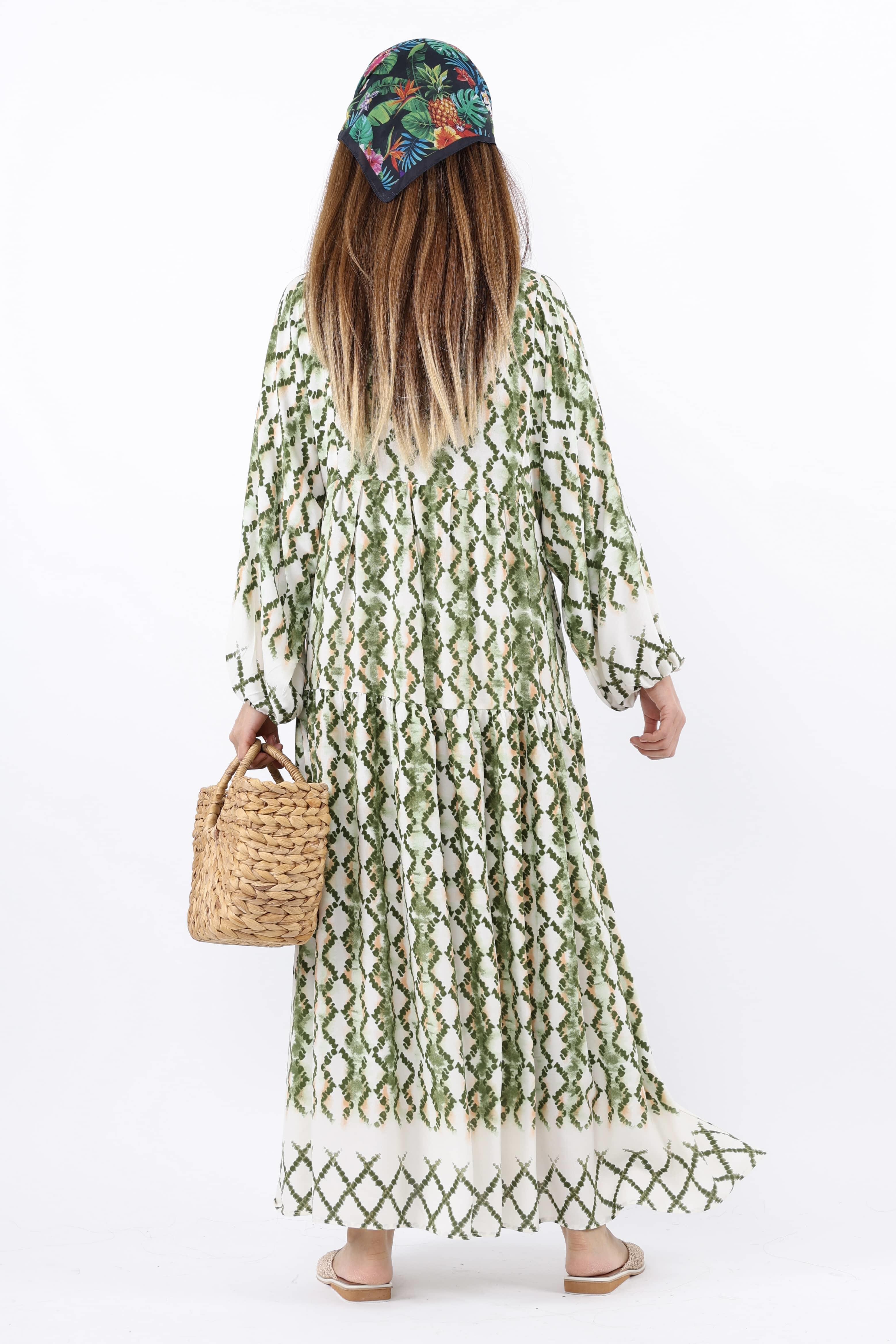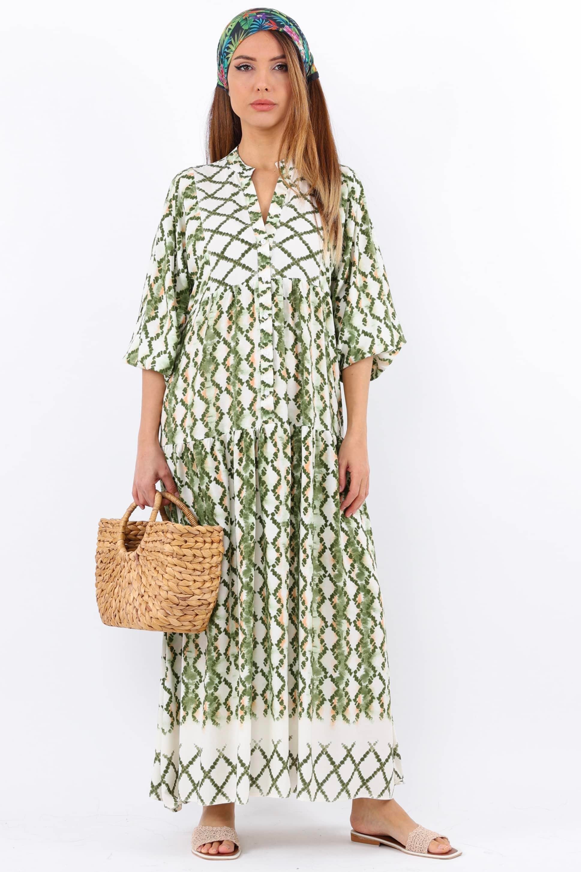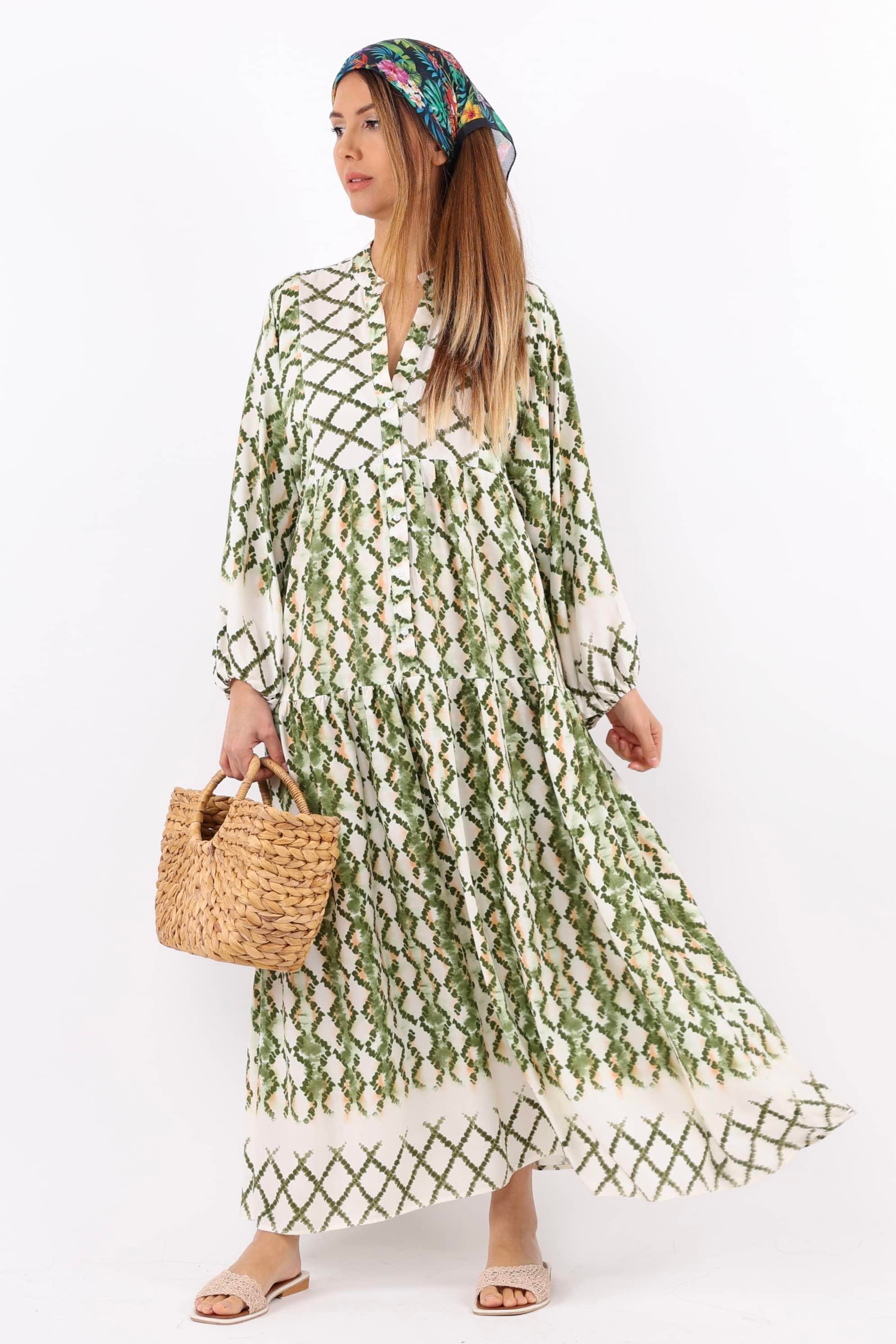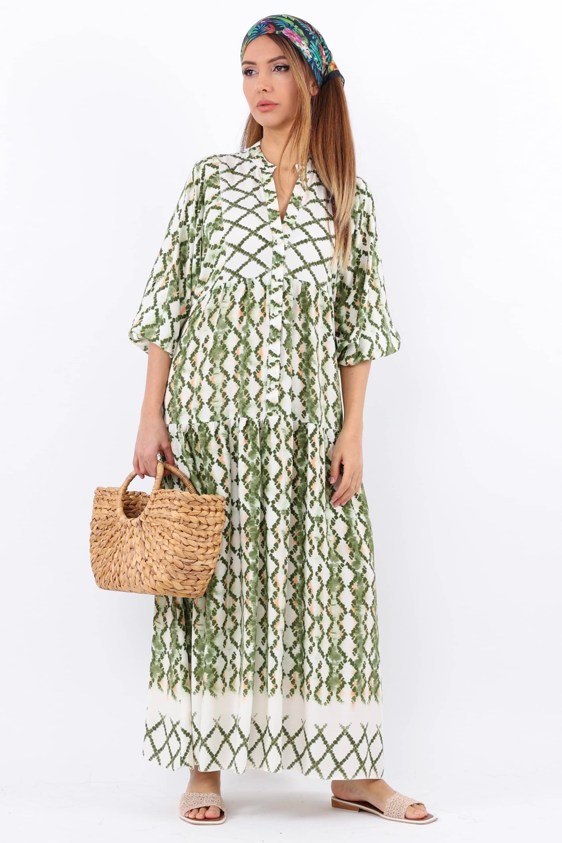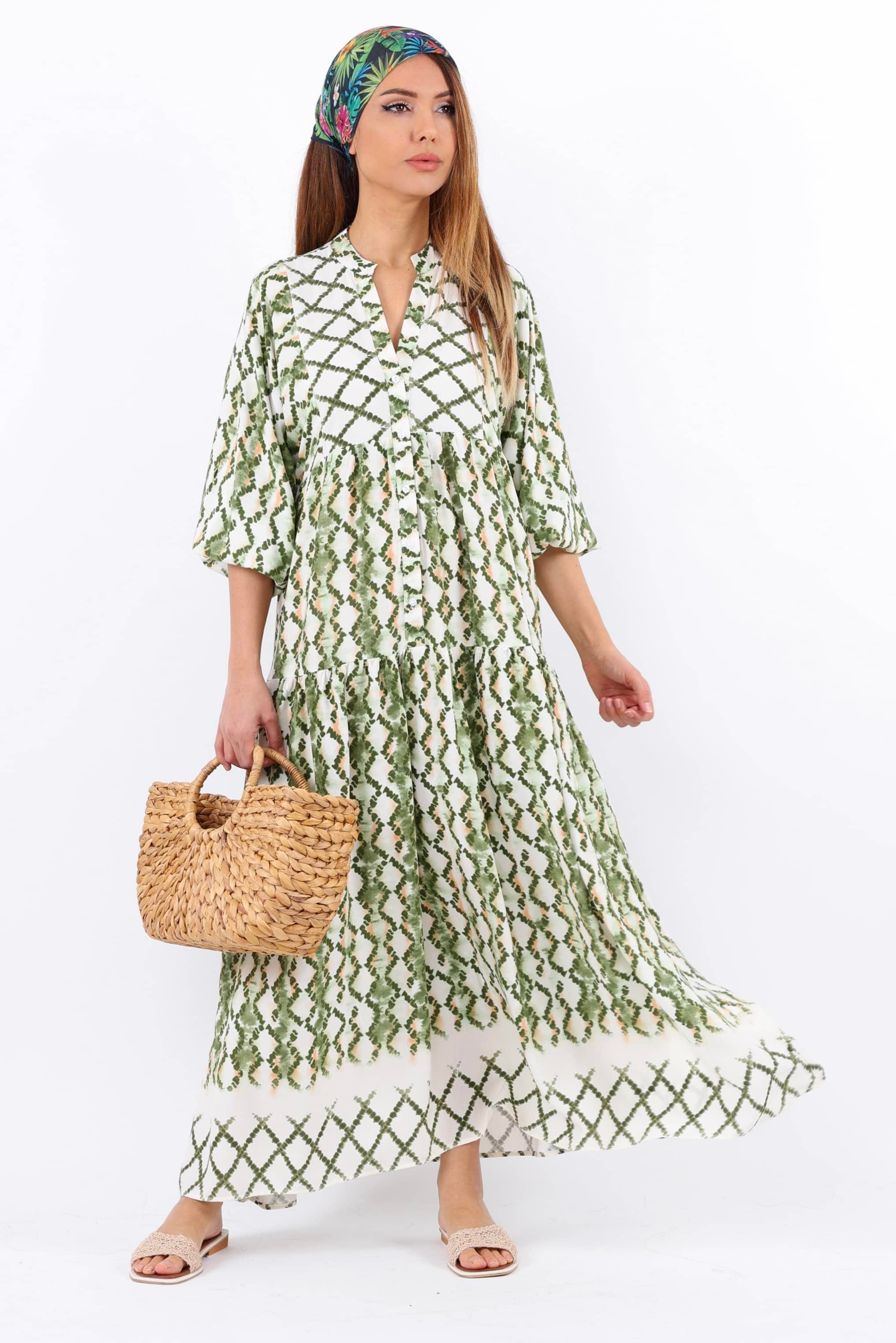 Prive Kadın Soft Yeşil %100 Viskon Maksi Boy Balon Kol Uzun Yazlık Elbise